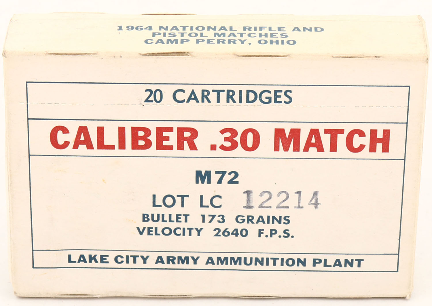 Lake City .30 Match M72, Lot LC 12214, 173 Gr. Bullet, 1964 Dated, 1pc, FULL & SEALED, white box & label with blue/red print, box is solid with light age soiling & light rub wear. Grade: Excellent + - Value: 20 to 40