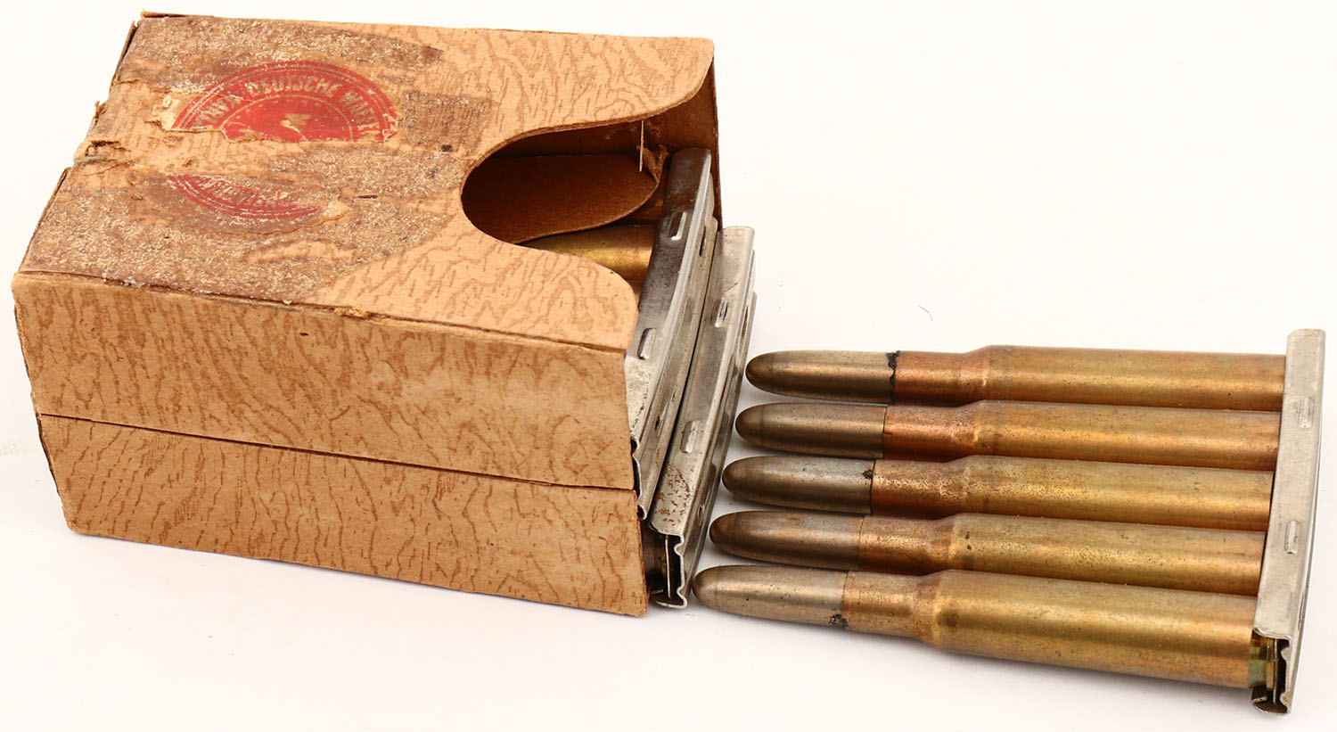 DWM, 7mm Mauser in clips, 2pc, Full, buff box with green label & black print, box is solid with light age soiling, rub marks & edge wear, ammo ranges from good to fair. (672) Grade: Very Good ++ - Value: 10 to 30