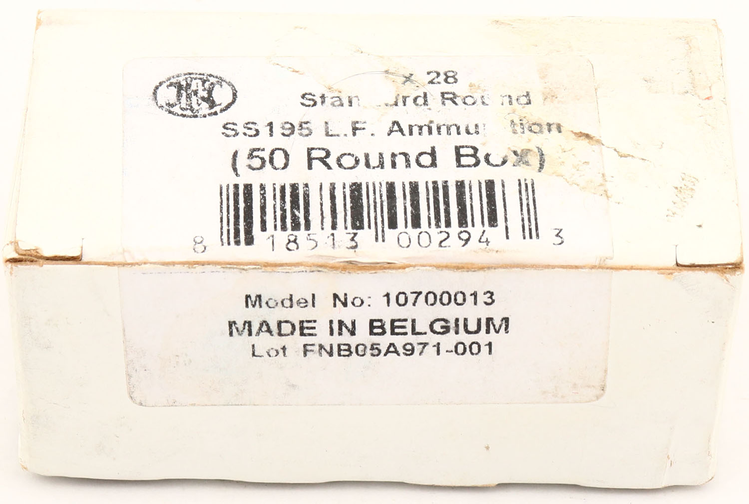 FN, 5.7x28mm, Standard Round, 1pc, Full, white box with white label & black print, box is solid with tape marks, light age soiling, light rub marks & edge wear, ammo is MINT. (1354) Grade: Very Good ++ - Value: 40 to 80