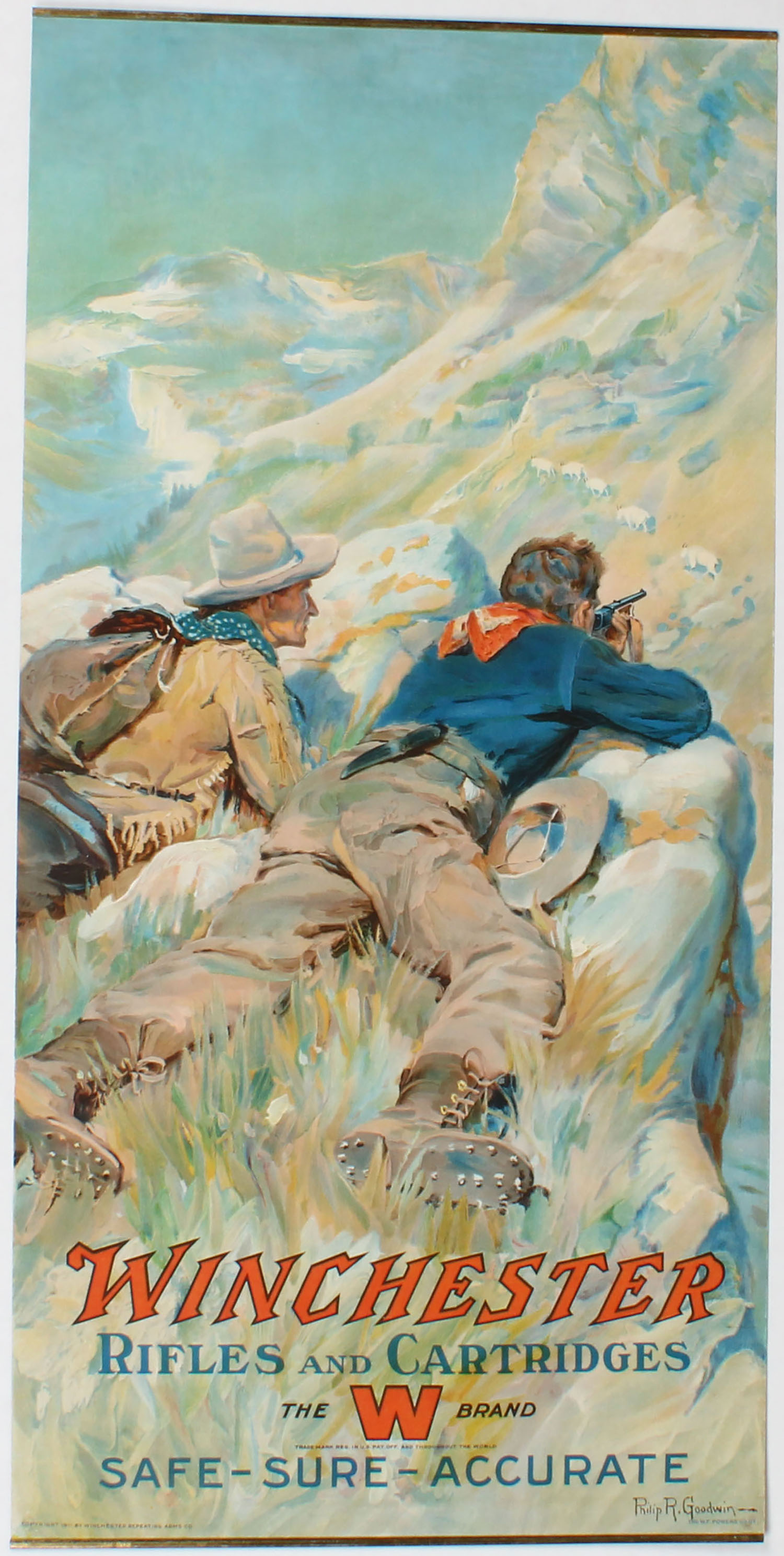 RARE Winchester Poster by Philip R. Goodwin, dated 1911, has fantastic vivid colors of two mountain goat hunters shooting across a ridge, ''WINCHESTER RIFLES AND CARTRIDGES SAFE-SURE-ACCURATE'', has brass bands top & bottom with no hanger, light professional restoration to top only, no edge wear or roll wrinkles, first time we have offered this one, Very Rare, great collector condition. Grade: Excellent + - Value: 6000 to 8000