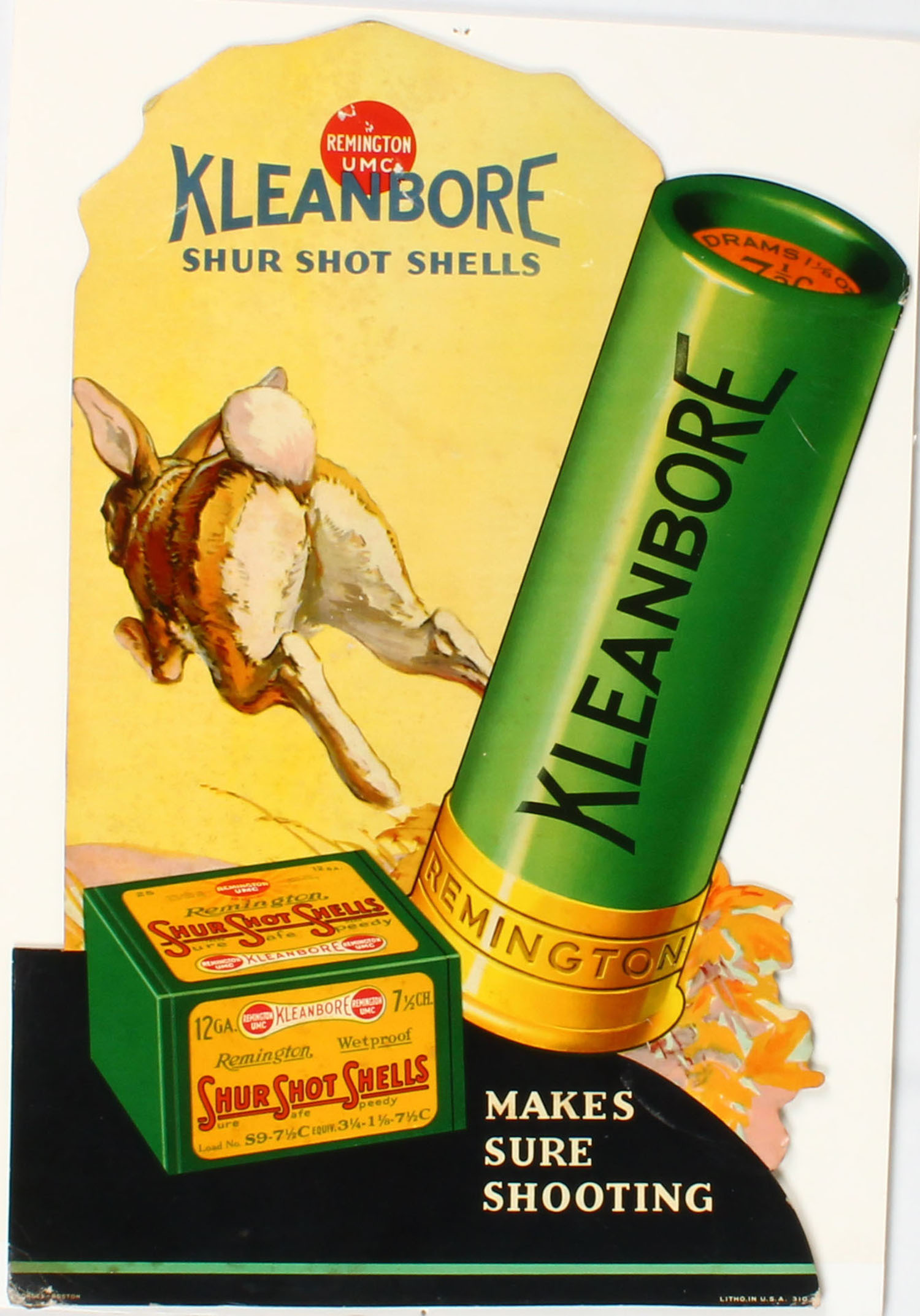 Remington Shur Shot, Kleanbore Diecut of running rabbit with 2pc shotshell box & large green shotshell, has easel back, has great colors, near mint, 13'' x 19''. Grade: Excellent ++ - Value: 800 to 1500