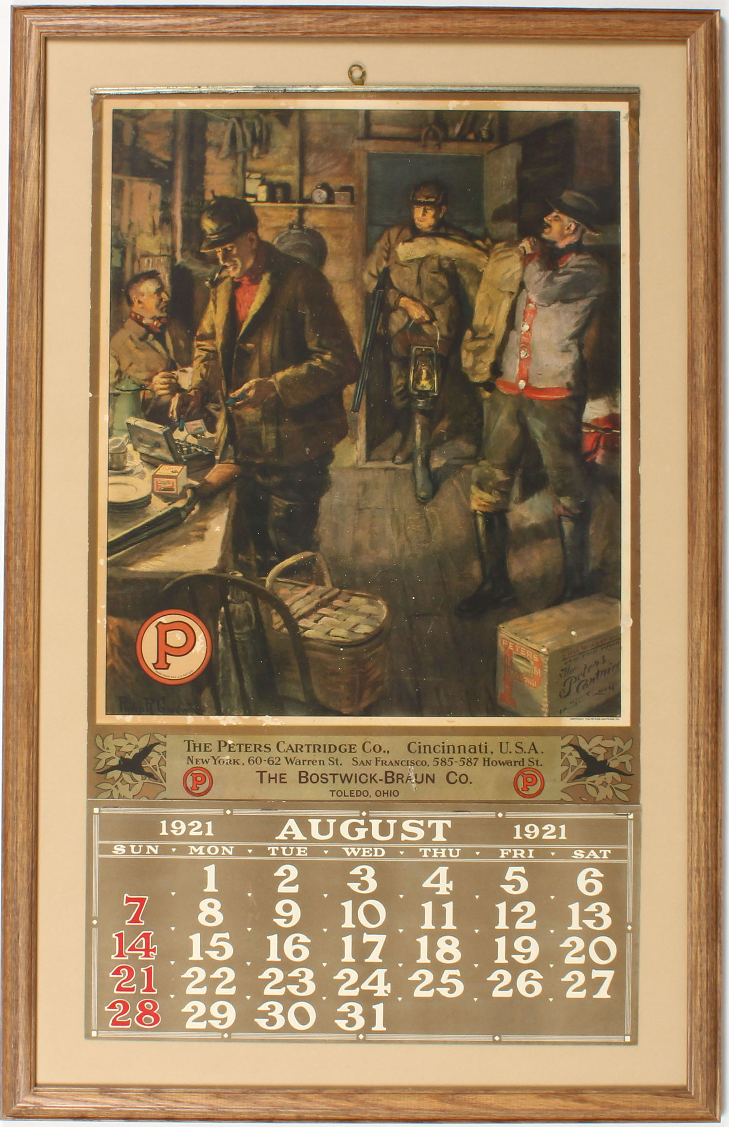 1921 Peters Calendar by Phillip R. Goodwin, very nice full color image of duck hunters in cabin with shotguns & 2pc Peters shotshell boxes, has top metal band with brass hanger, Aug page, 15'' x 26 1/4'', has no wear in the image with very slight tears just out side the image, some light age soiling. Grade: Excellent - Value: 800 to 2500