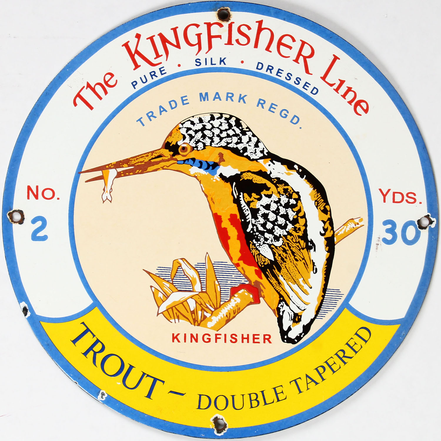 The KingFisher Line porcelain sign, Trout - Double Tapered, No. 2, Yds. 30, 12'' in diameter, has hold in all four sides. Grade: Excellent - Value: 30 to 150