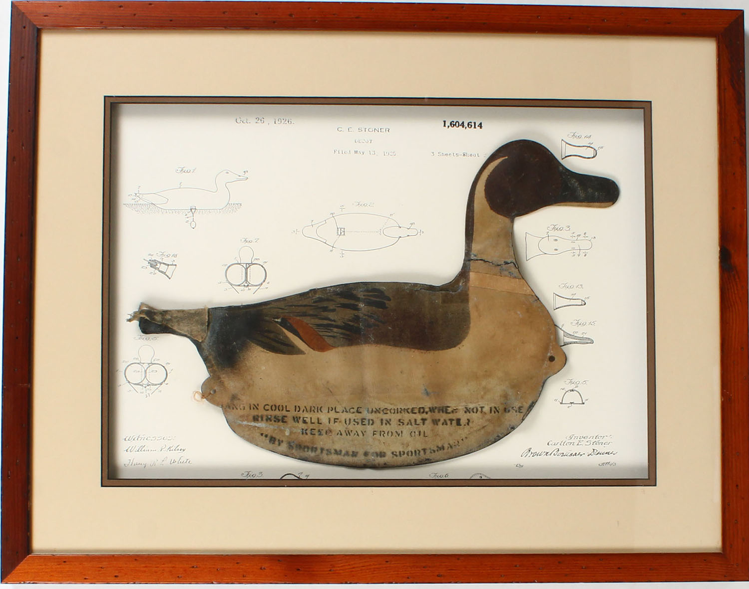Rare Early C.E. Stoner Water Ballast Decoy by Rubbercraft Corp., Pintail drake rubber decoy is frame with drawings of construction of decoy in background, dated Cot. 26, 1926, 20 1/2'' x 14'', shadow box style framing. Grade: Excellent - Value: 50 to 200