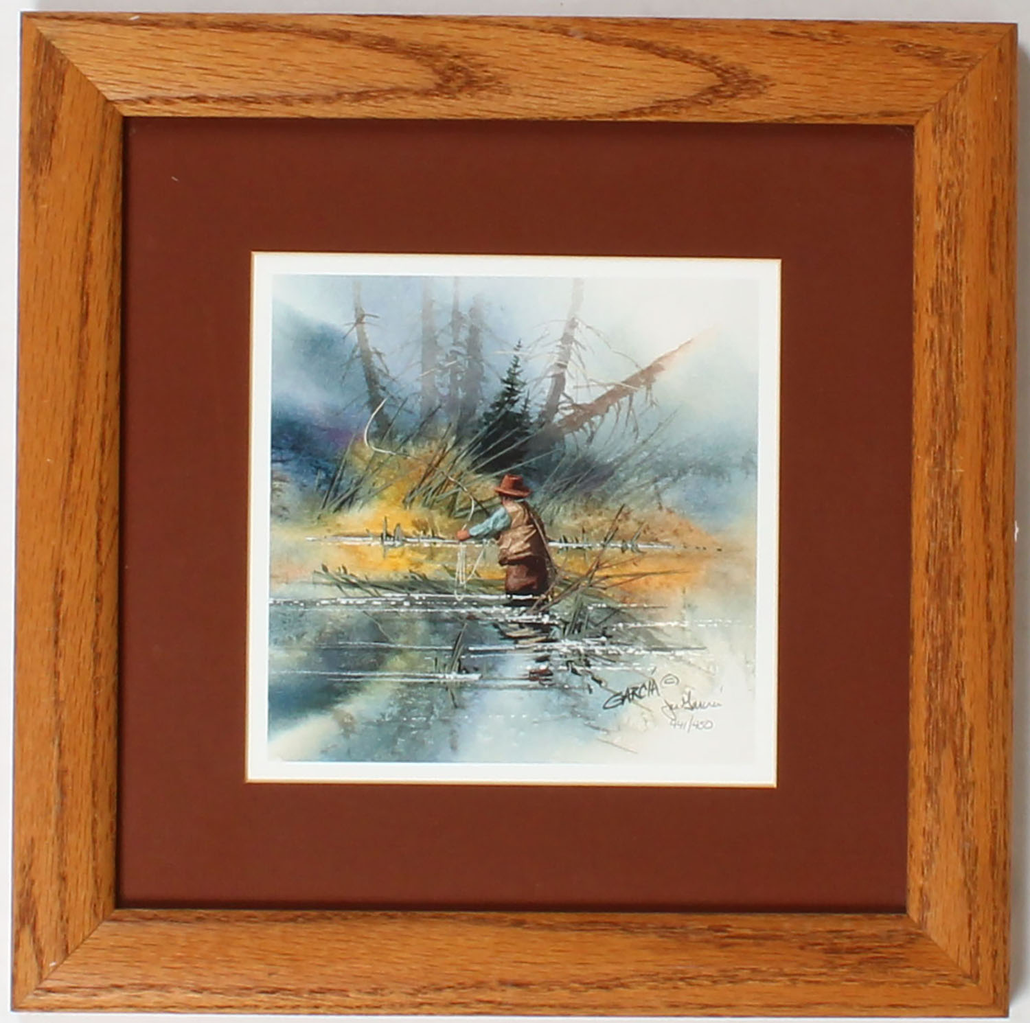 Fly Fishing print by J. Garcia, ''Pocket Water'', has wonderful colors, 441/450, 6 1/2'' square image size framed. Grade: MINT - Value: 10 to 80