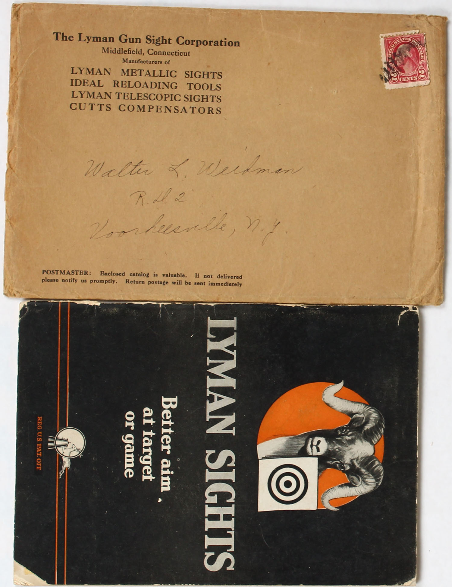 Lyman Sights Catalog with price list, has original mailing envelope, many detail images of sights, 52 pages, 5 1/4'' x 7 1/2'', shows some edge wear. Grade: Very Good + - Value: 10 to 60