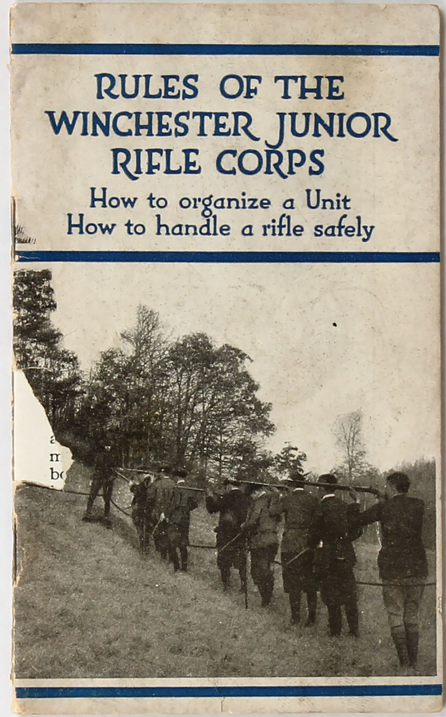 Winchester Junior Rifle Corps booklet, pictures Winchester .22 rifles, ammo boxes & shooting position, 37 pages, 3 1/4'' x 5 1/2'', shows light age soiling & small piece missing from cover. Grade: Very Good + - Value: 6 to 50