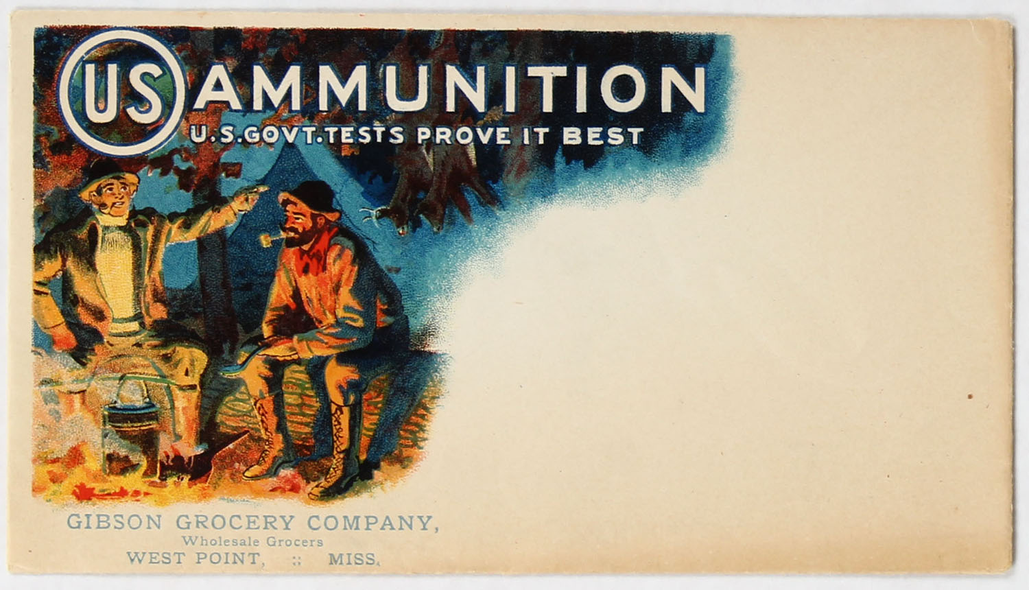 US Ammunition envelope unused, has great full color image of two hunters in camp. Grade: Excellent + - Value: 50 to 150