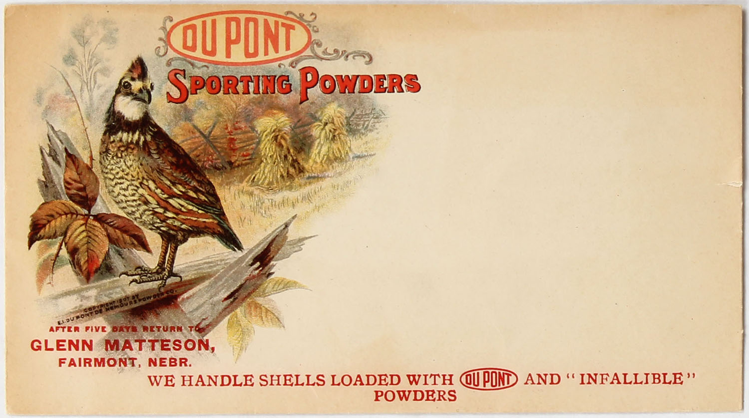 Dupont Sporting Powders envelope, has full color image of quail standing on fence, has red, blue & black print on back. Grade: Excellent - Value: 40 to 150