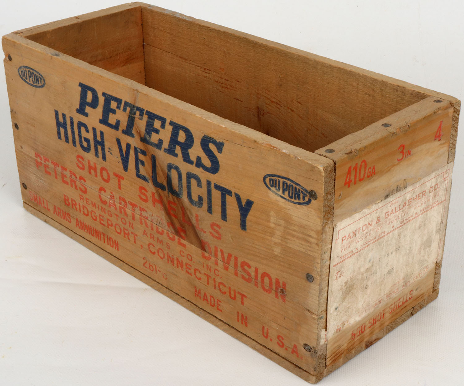 Peters High Velocity 410 ga., nail construction, orange & blue print is solid, crate is solid. Grade: Excellent - Value: 30 to 80