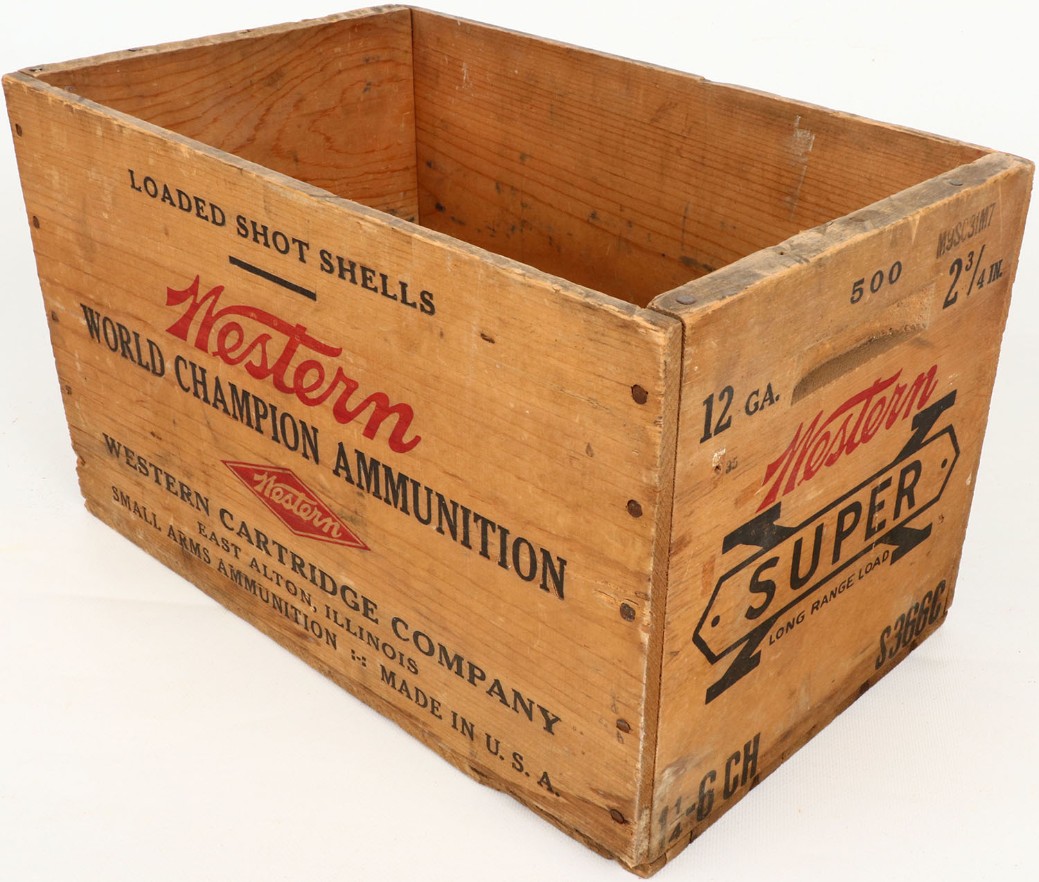 Western Super-X, 12 Ga., 2 3/4, 6 Ch., nail construction wood shipping crate, black & red print is solid, and the crate is solid with some light age soiling. Grade: Excellent - Value: 10 to 40