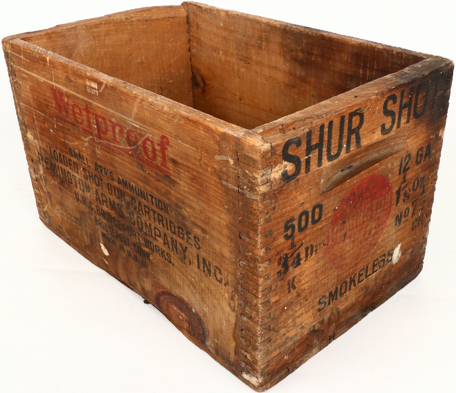 Remington UMC Shur Shot, 12 Ga., 7 1/2 ch., tongue and groove construction wood shipping crate, black & red print has some fading and the crate has age soiling. Grade: Very Good - Value: 16 to 50