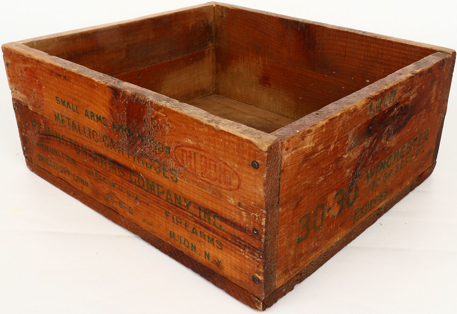 Remington 30-30., nail construction, red, & green print is fading, crate has some age soiling and wear. Grade: Very Good - Value: 10 to 40