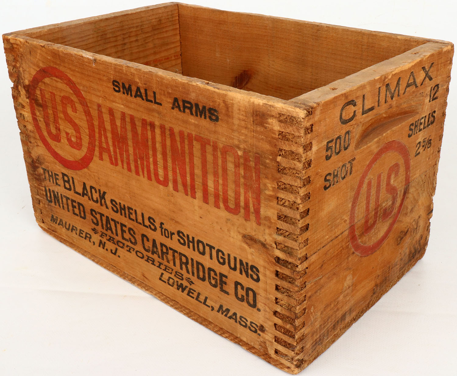 US Climax, The Black Shells, 12 ga., tongue and groove construction wood shipping crate, red & black print is faded, crate is solid. Grade: Very Good ++ - Value: 20 to 80