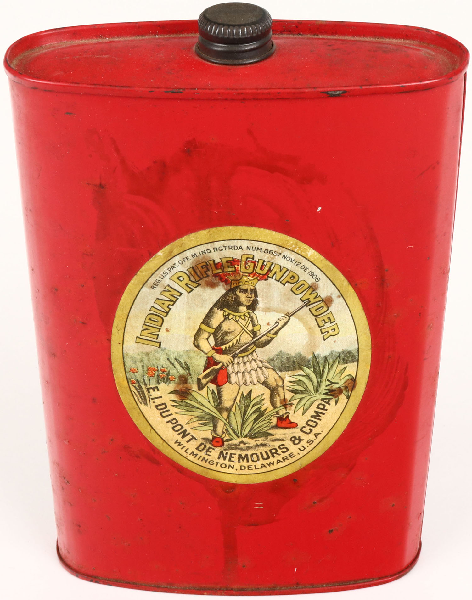 DuPont Indian Rifle Gunpowder tin, Empty, very bright and clean. Grade: Excellent - Value: 50 to 150