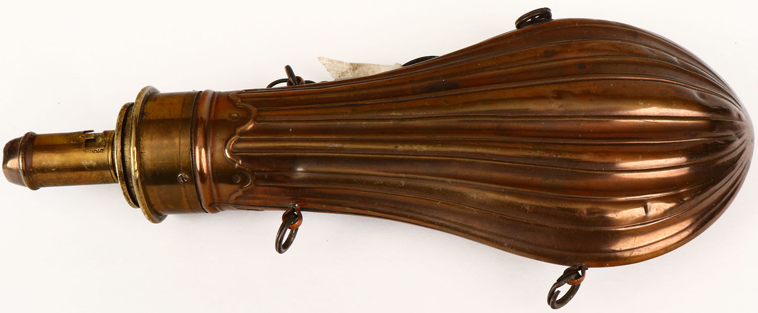 AM Flask & CAP CO. Brass powder flask, beautiful design, bright and clean. Grade: Very Good ++ - Value: 50 to 150