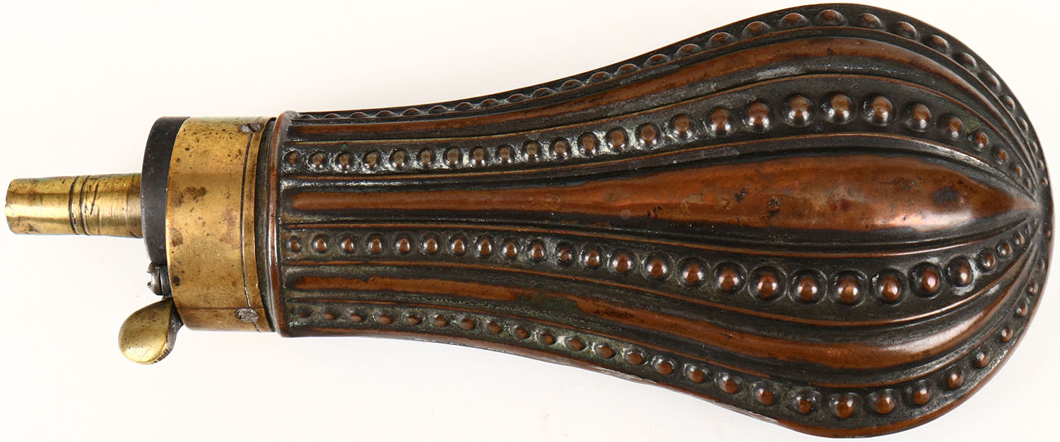 Small Brass powder flask, beautiful design, 5'' long. Grade: Excellent - Value: 40 to 150
