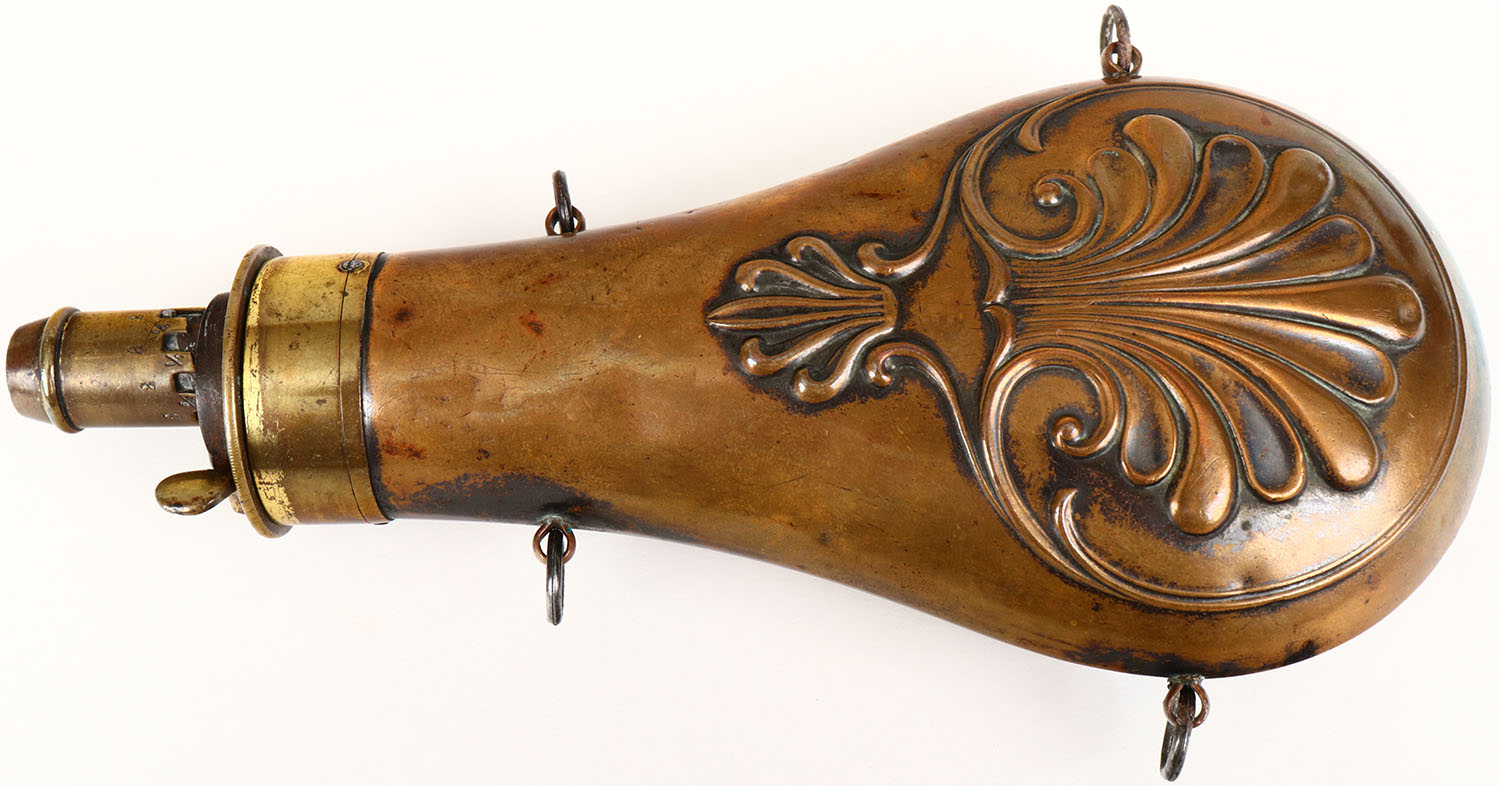 American Flash & Cap Co. Brass powder flask, beautiful Shell & Wreath design, some age soiling. Grade: Excellent - Value: 50 to 150