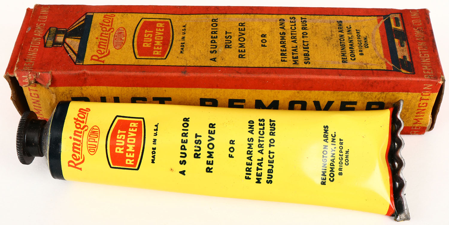 Remington Rust Remover tube, in original box, tube is bright and clean, box has scuffing and age soiling. Grade: Excellent + - Value: 20 to 60