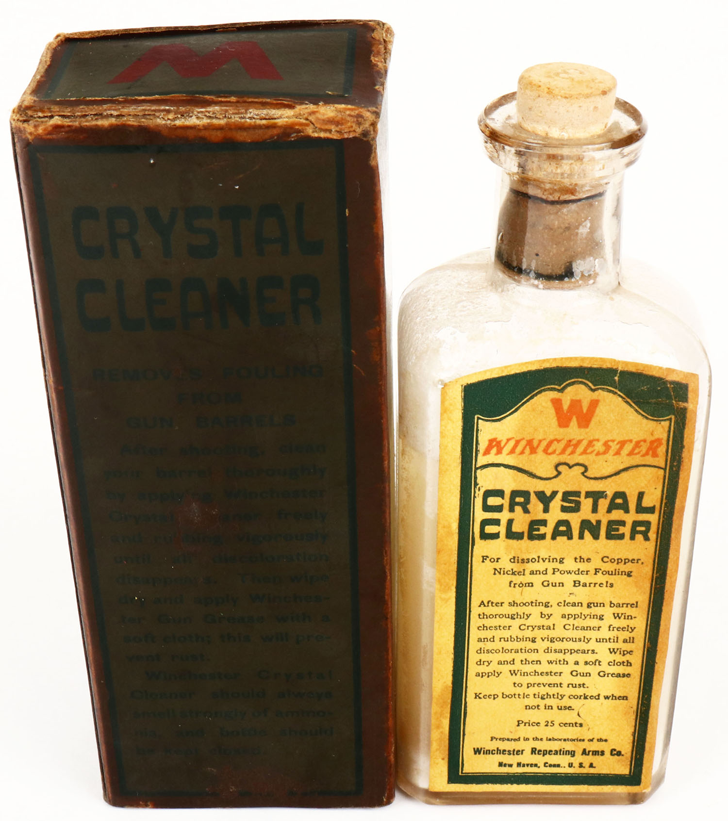 Winchester Crystal Cleaner glass jar, in original box, heavy soiling from cleaner. Grade: Good ++ - Value: 10 to 50