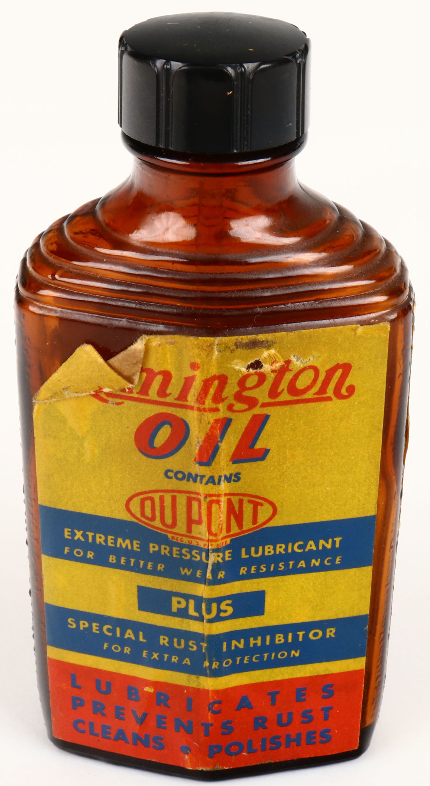 Remington Gun Oil, glass jar, partial, solid, has age soiling. Grade: Very Good ++ - Value: 30 to 90