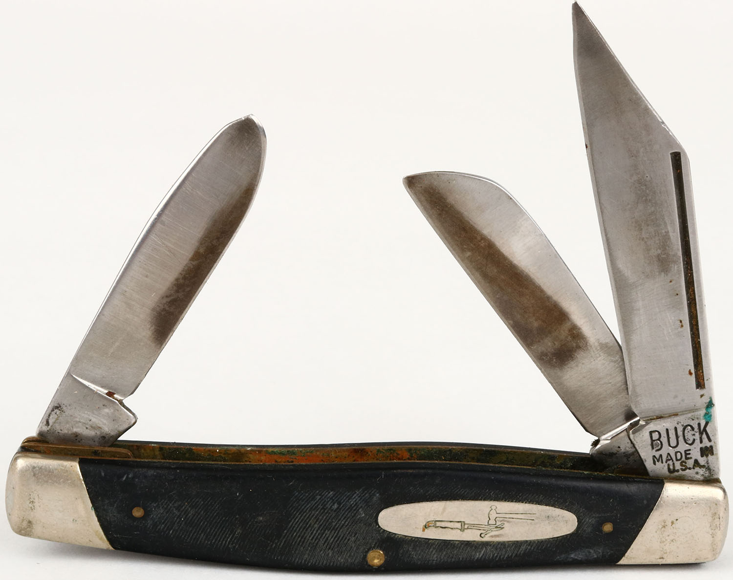Buck knife, celluloid grip, 3 blades, longest blade is 2 1/4'', blade has age soiling. Grade: Very Good - Value: 10 to 50