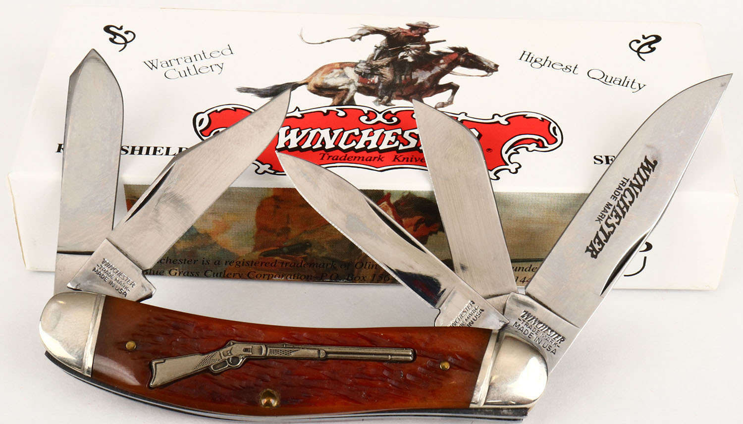 Winchester folding knife, in original box, W15 59117 1/2, burnt orange bone handle. Grade: MINT - Value: 50 to 200