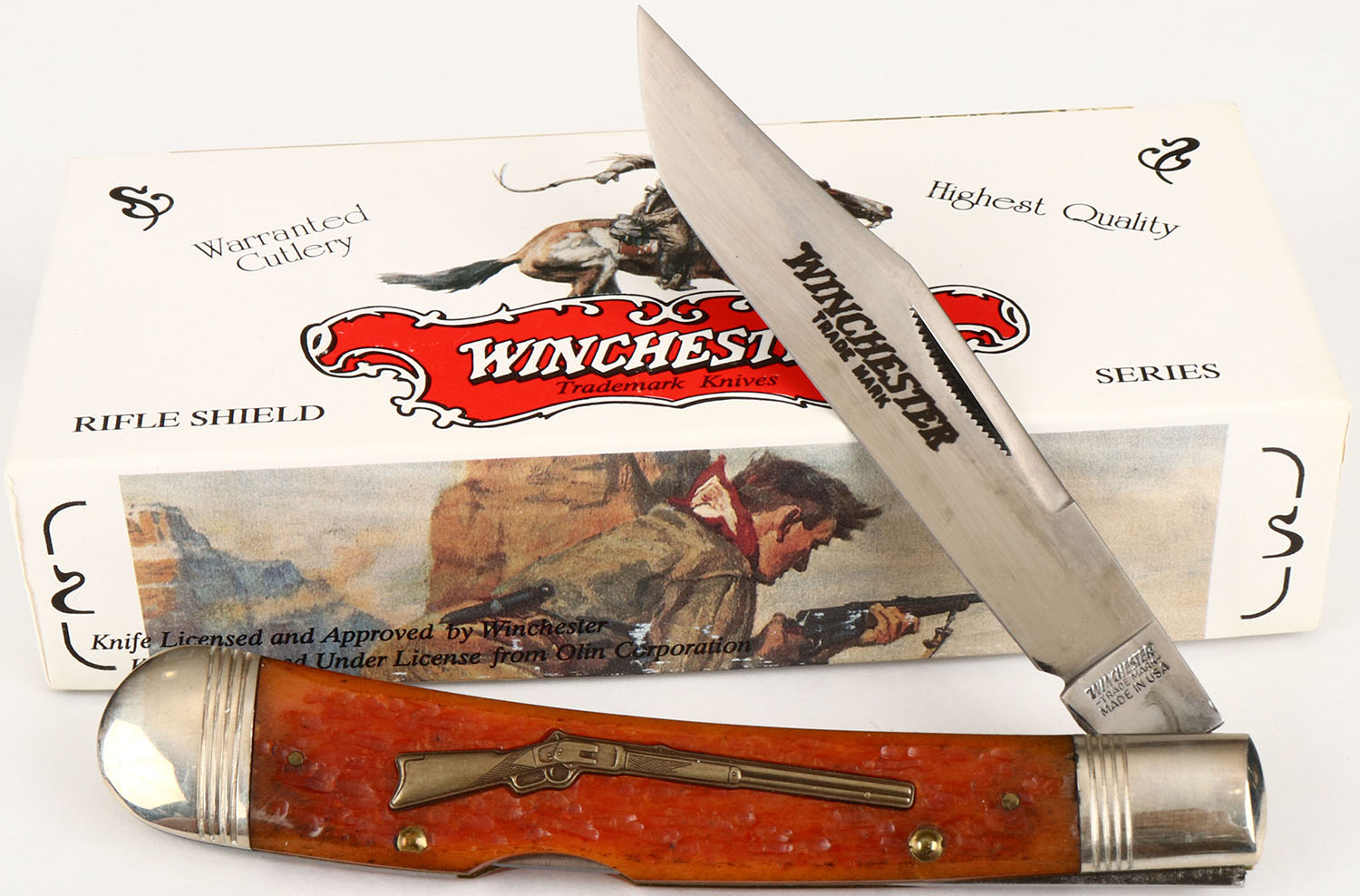 Winchester folding knife, in original box, W15 19107 1/2, burnt orange bone handle. Grade: MINT - Value: 50 to 200