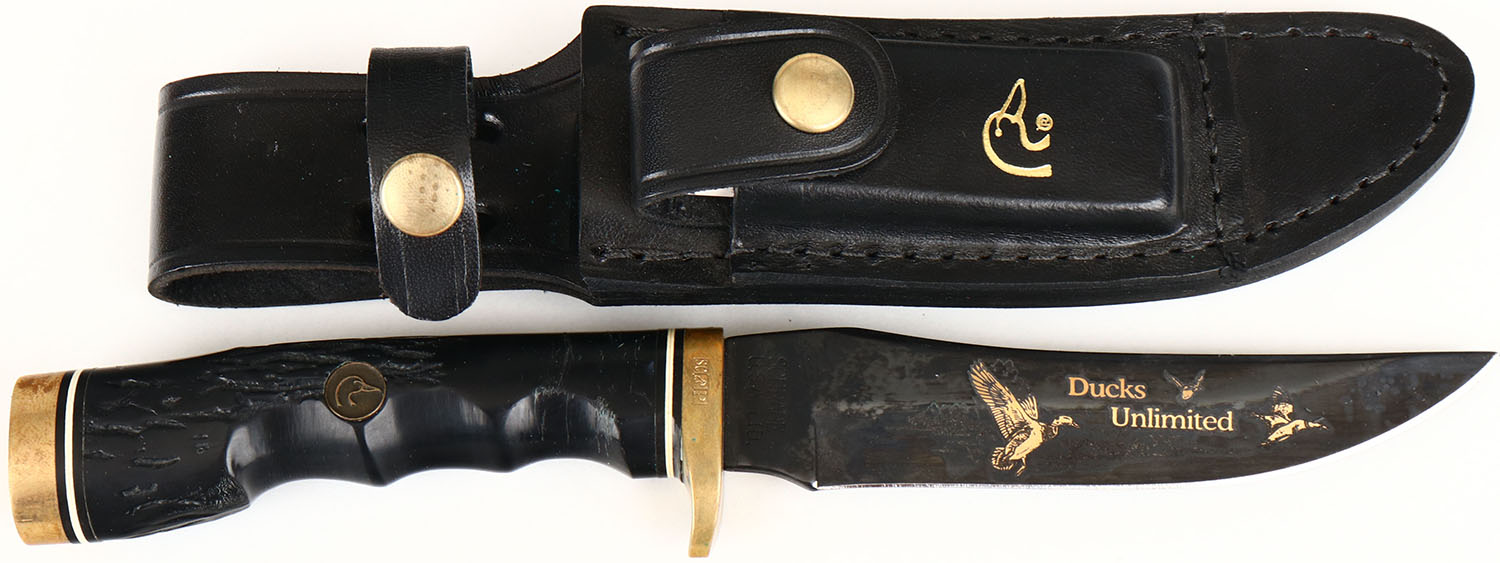 DU fixed blade knife with orignal leather sheath with sharpening stone, half hilt, celluloid handle, solid and clean. Grade: Excellent - Value: 40 to 100