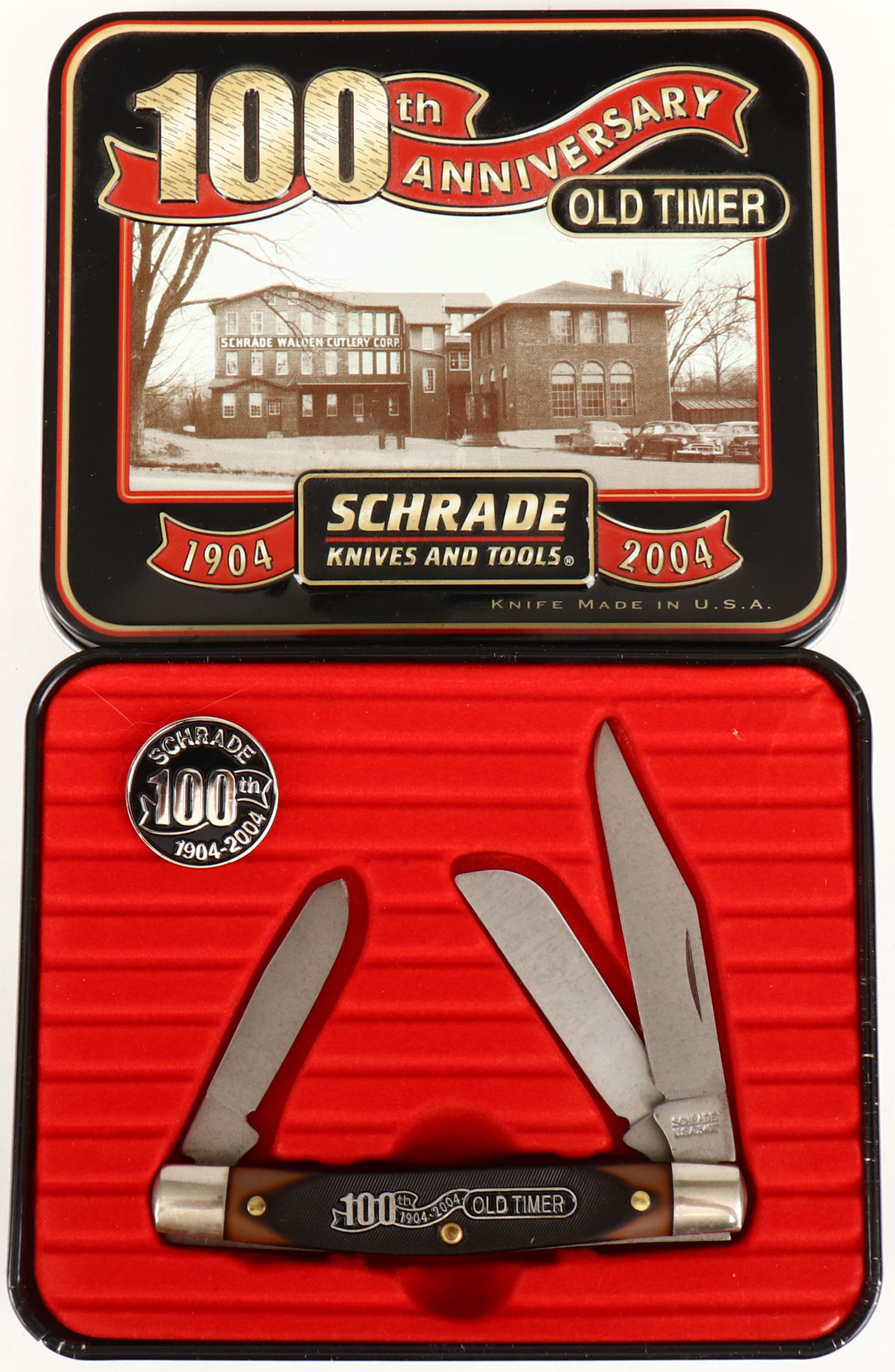Schrade 100th anniversary Old Timer multi folding knife in tin, very bright and clean. Grade: Excellent - Value: 20 to 100