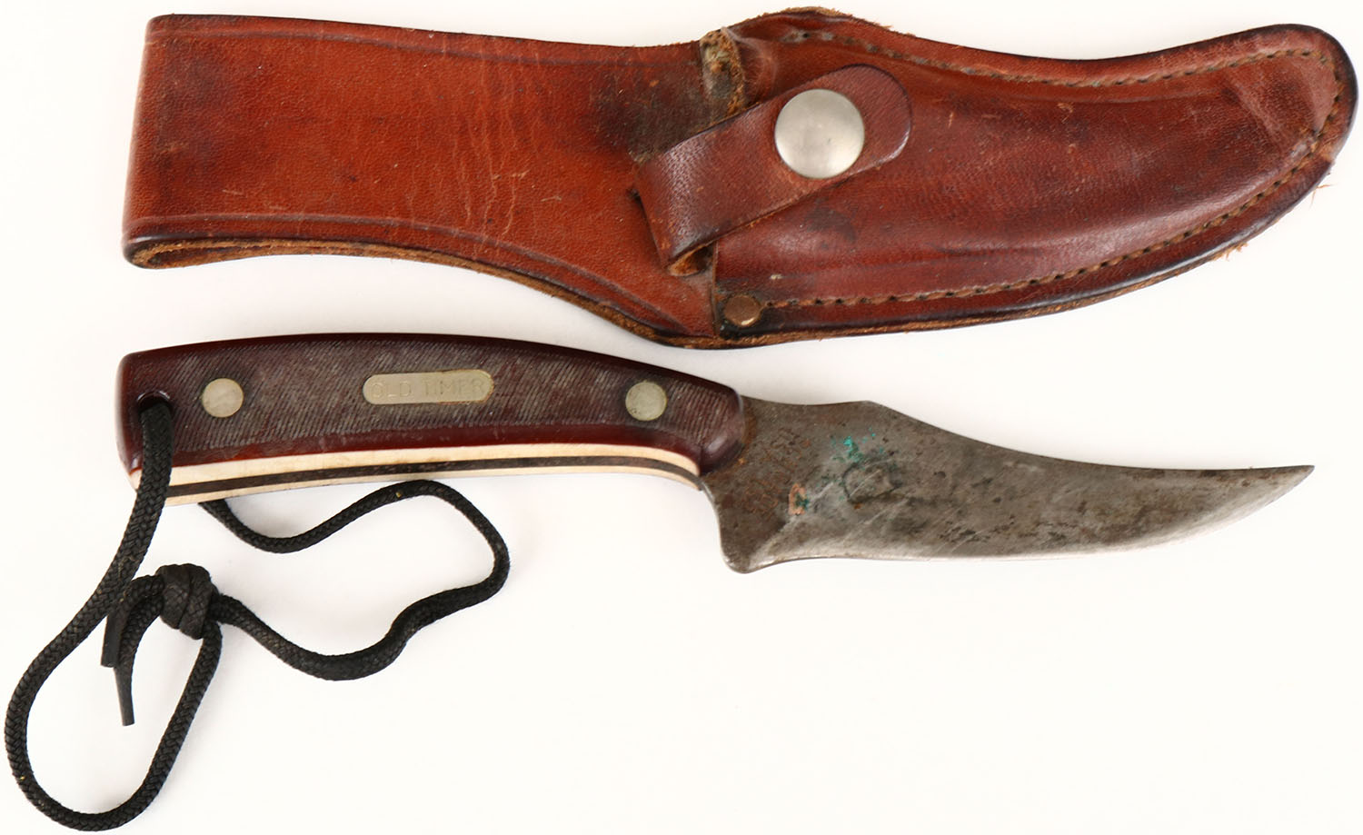 Schrade Old Timer fixed blade knife, in orignal sheath, has lots of age soiling and some rust. Grade: Very Good - Value: 10 to 60