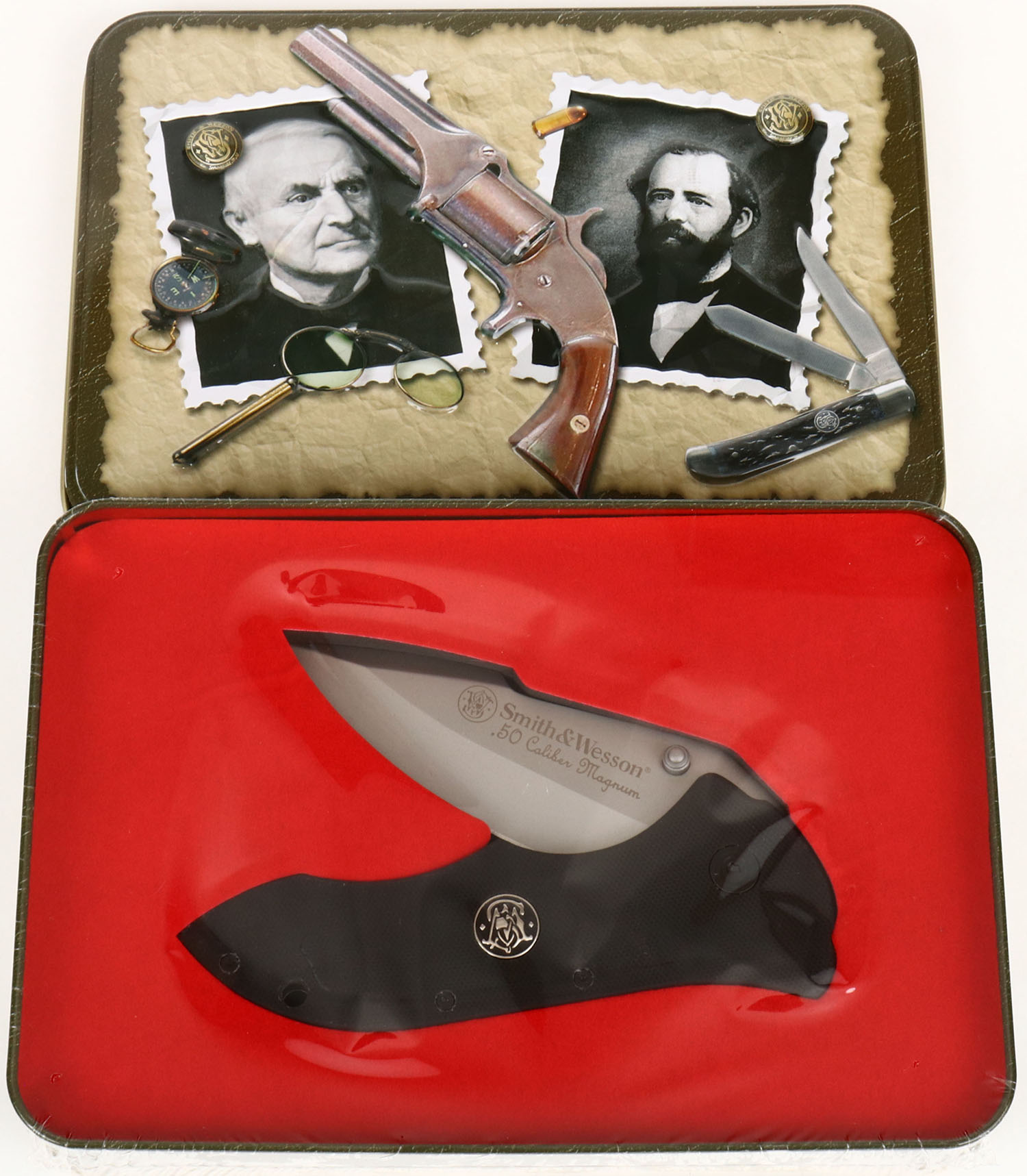 S&W knife in metal tin, in orignal plastic wrap. Grade: MINT - Value: 30 to 90