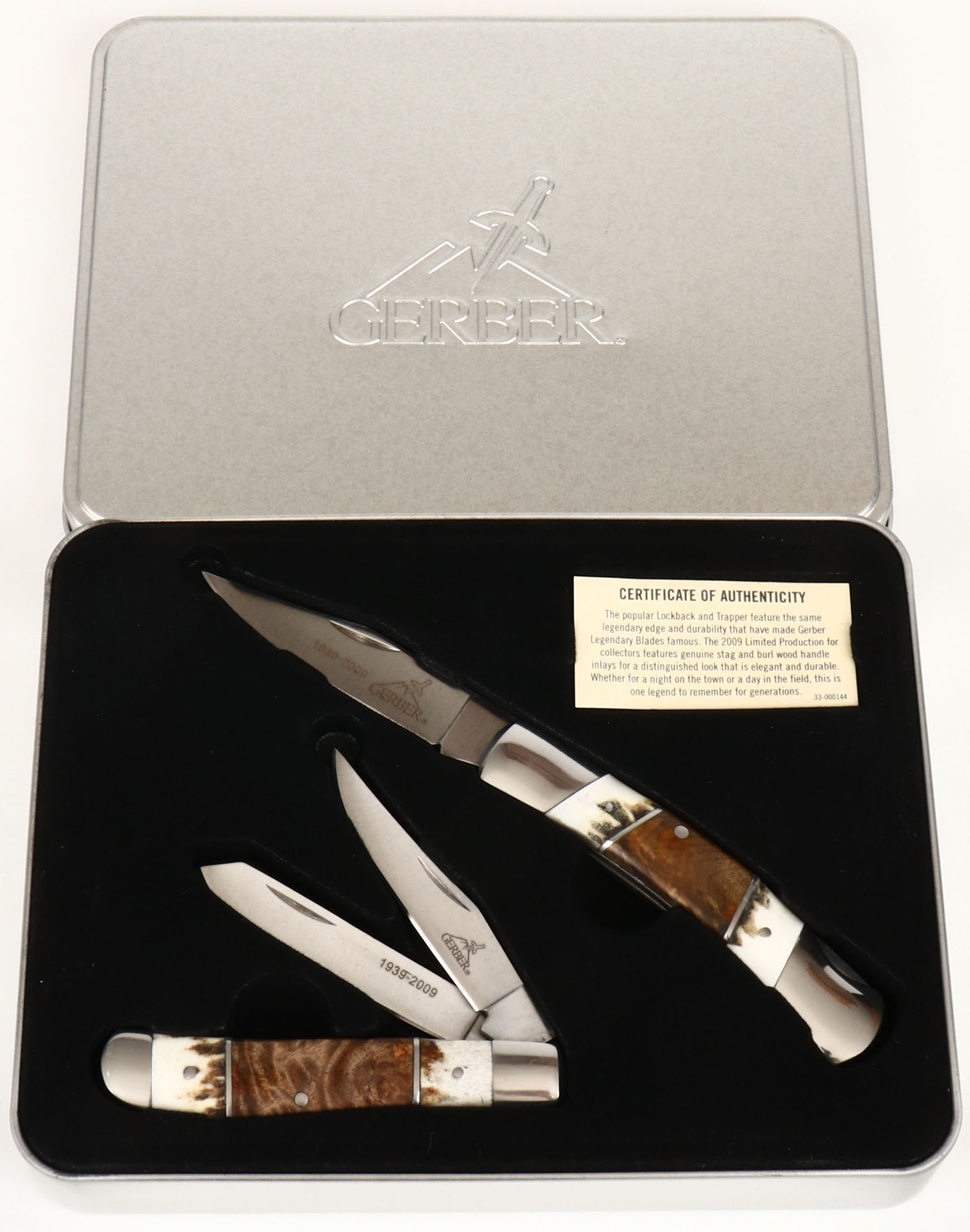 Gerber knife set in metal tin, 2 knives and certificate of authenticity. Grade: MINT - Value: 30 to 90