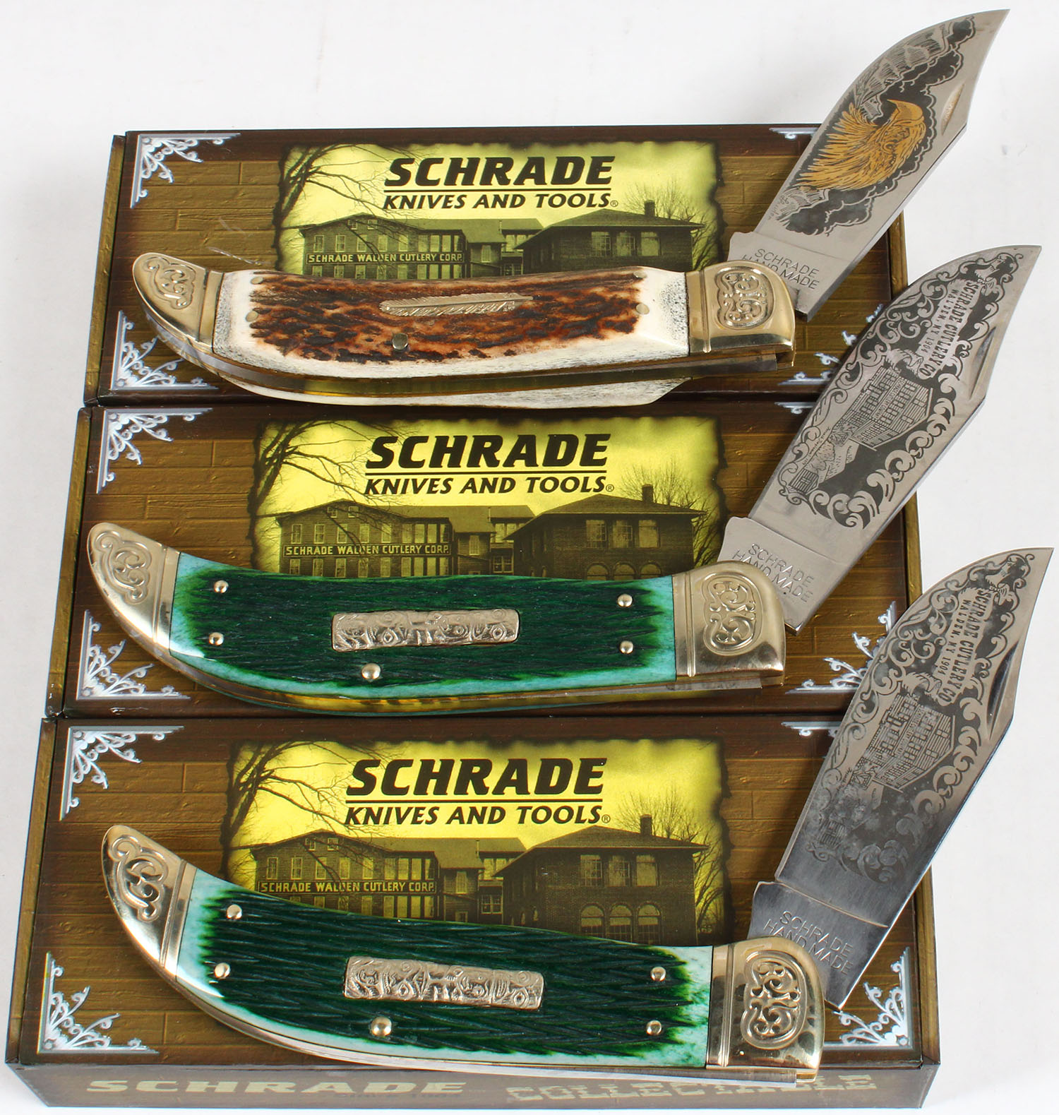 Lot of 3 Schrade folding knives in orignal boxes, all NIB. Grade: Excellent ++ - Value: 20 to 80