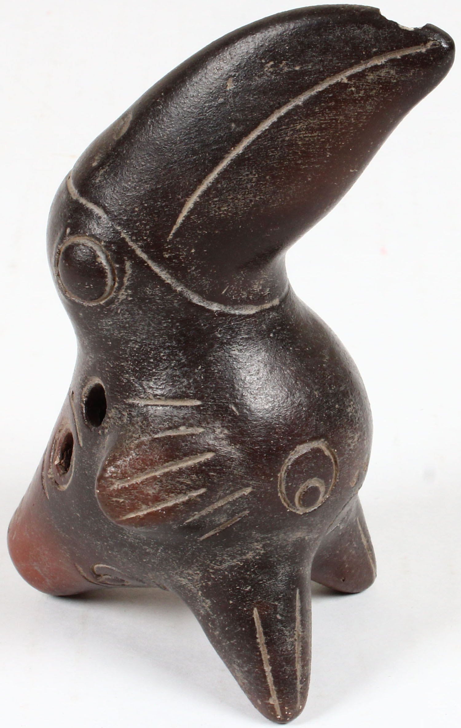 RARE! Clay Pottery Parrot(macow) bird flute from the Pueblos of the SW US., circa 1500-1600s, these types of parrots were made widely in the SW region of the US long ago, The pueblo Indians used to trade for Macaws with SW US Indians and became huge part of the Pueblo culture. Small chip in the left side of the beak. Stands 4 3/4''. Grade: Very Good - Value: 100 to 1000