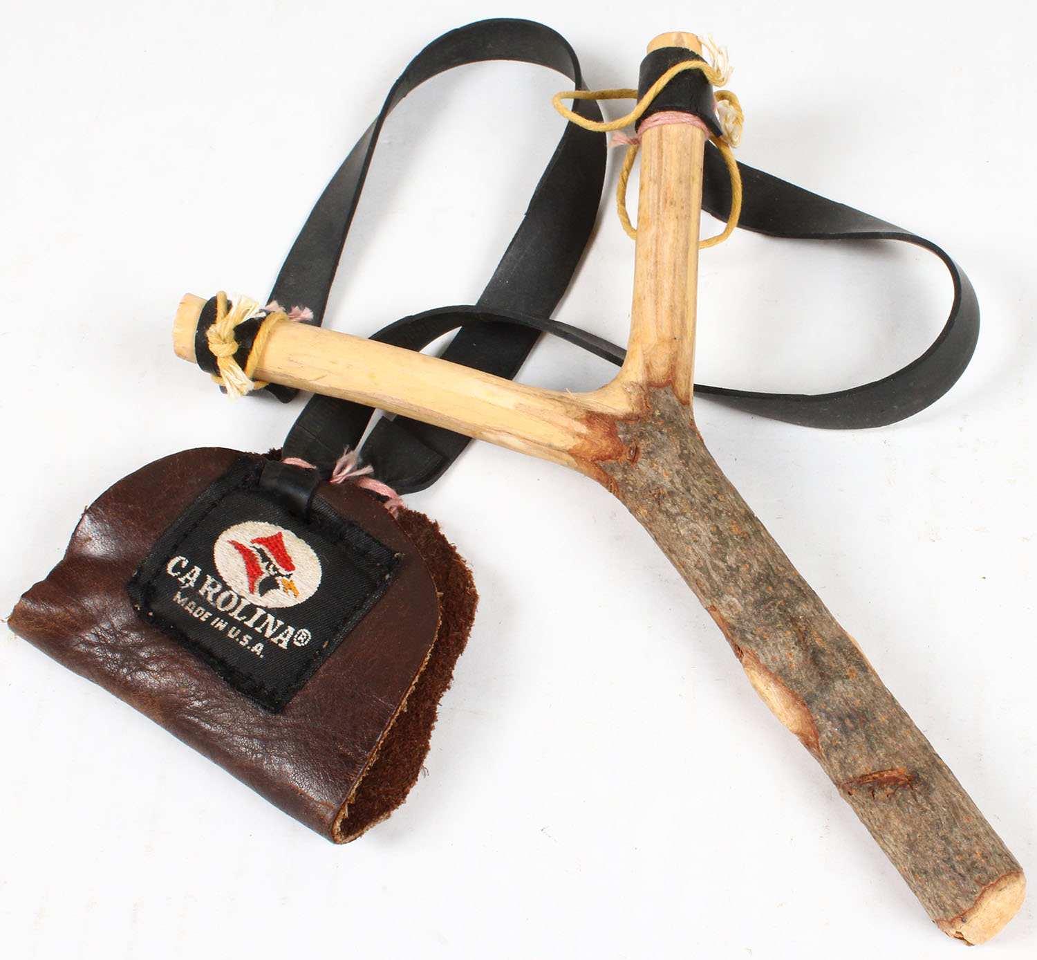 Slingshot, Handcrafted in the U.S.A. made by Carolina. Leather pouch. Grade: Very Good - Value: 2 to 20