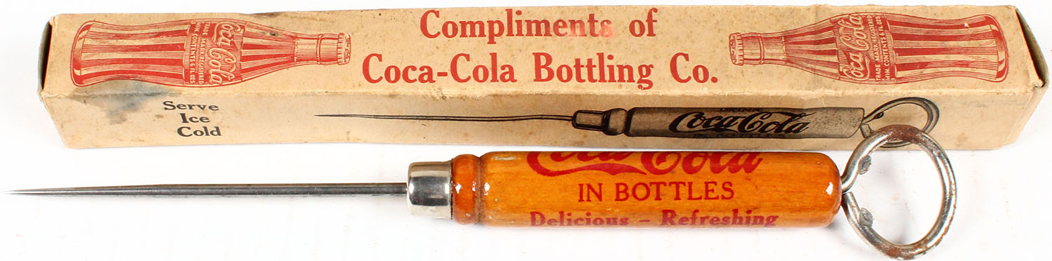 Coca-Cola ice pick and bottle opener in orignal box. Grade: Excellent - Value: 10 to 50
