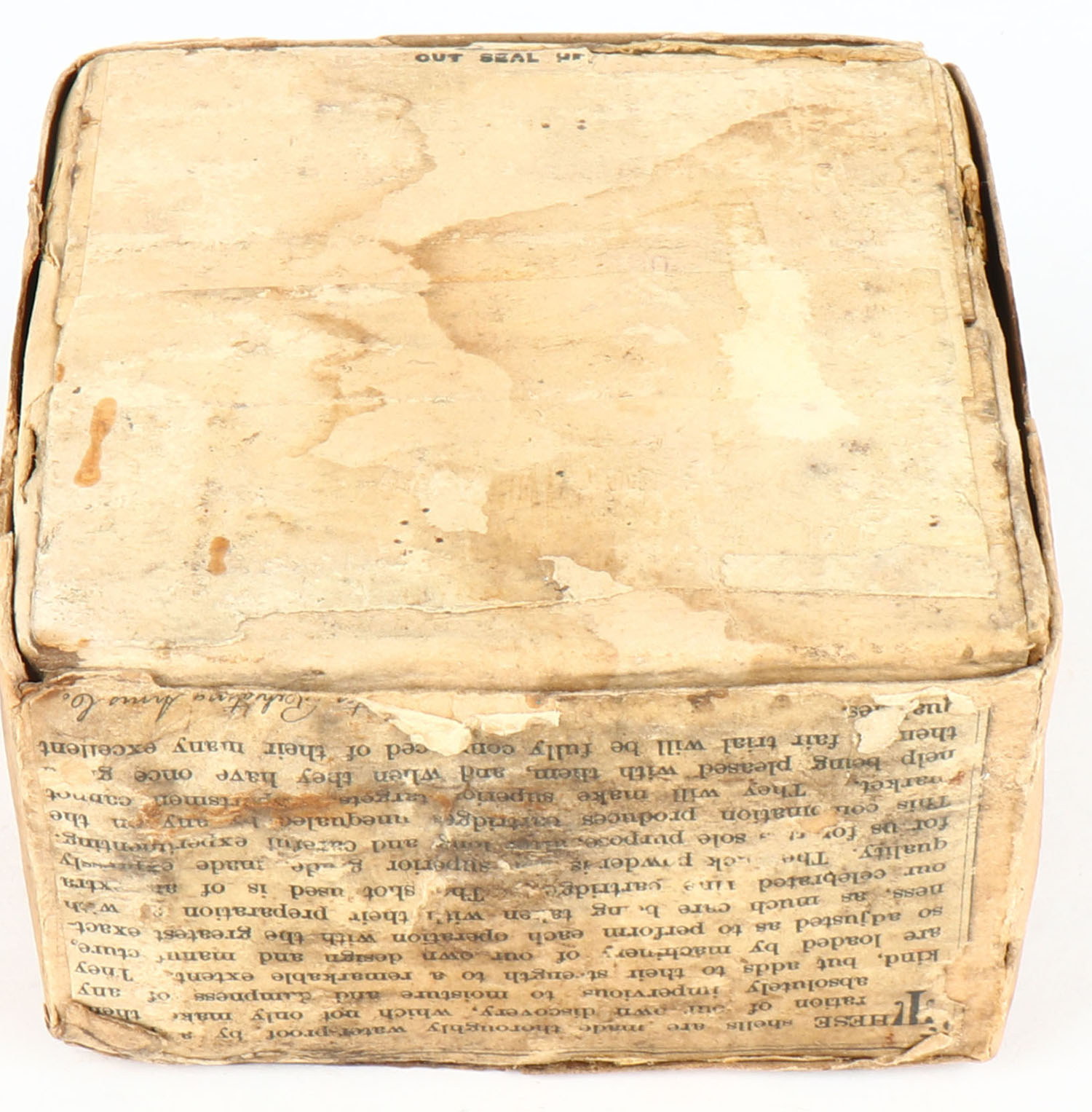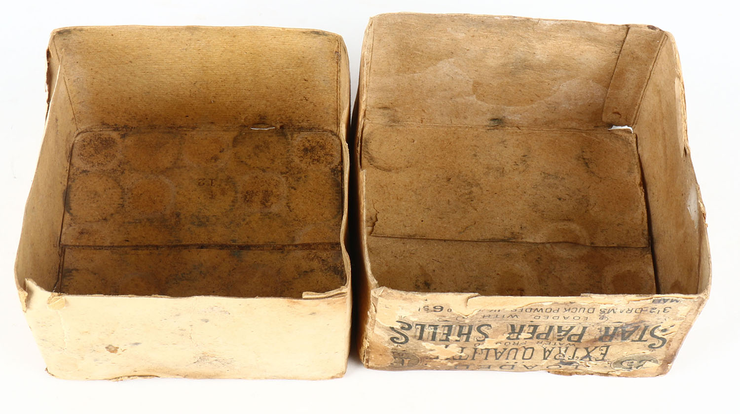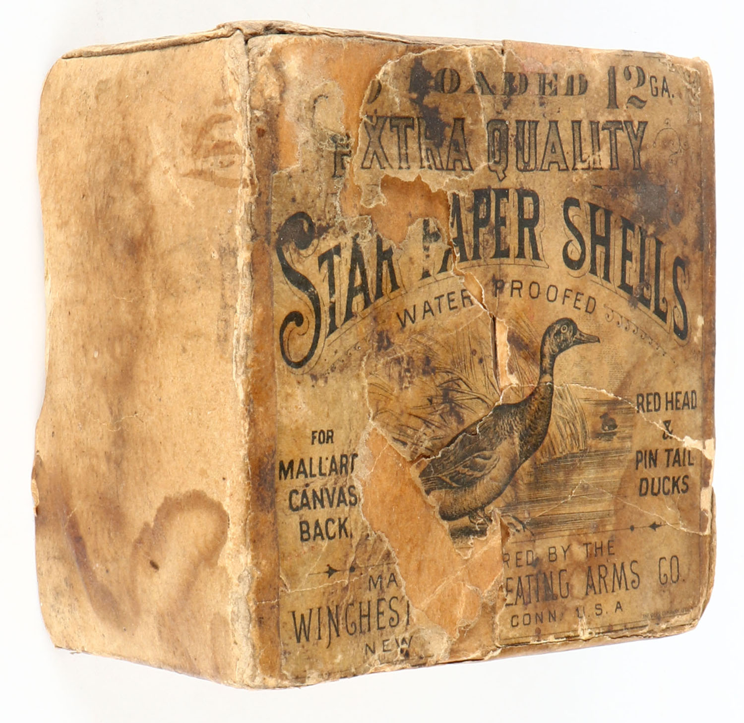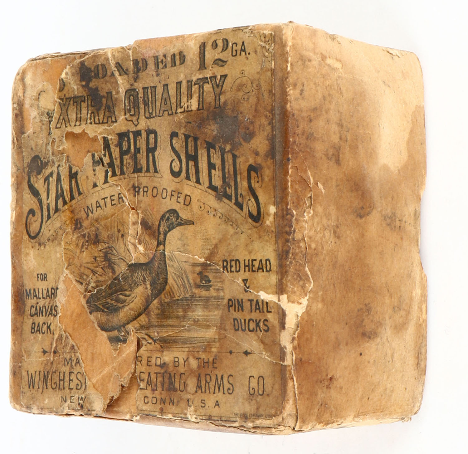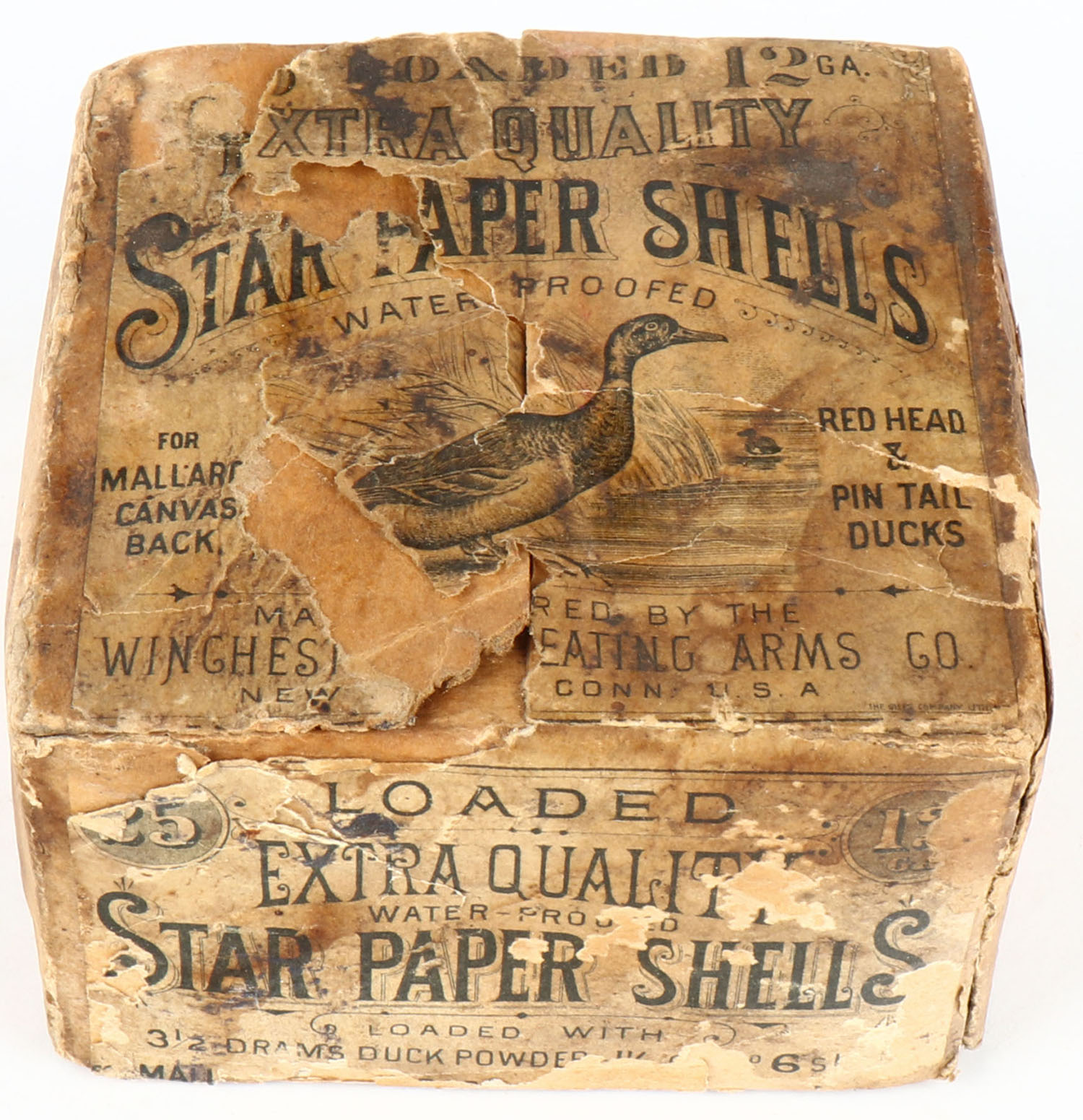 EXTREMELY RARE AND VERY FEW KNOWN TO EXIST, Winchester STAR PAPER SHELLS, EXTRA QUALITY, this box is a combination of two of the rarest boxes Winchester ever made, which makes this rare box, the only one known to exist. It looks very similar to a box listed as only one known in the book but it has one difference, this box does not say Winchester, it says EXTRA QUALITY at the top, pictures the Drake Mallard leaning forward on the water's edge. For Mallards, Canvasbacks, Redheads & Pintail Ducks, 12ga., 2pc., empty, loading: 3 1/2 Drams Duck Powder, 6 Shot, buff box, box & label shows age soiling, label has a few tears. This box would be a good candidate for restoration, (we can help the buyer with this process), we cannot stress enough the rarity of this box, no matter the condition, it is one of just a few known. This would be the HOLY GRAIL to any collection!* - Value: 10000 to 50000