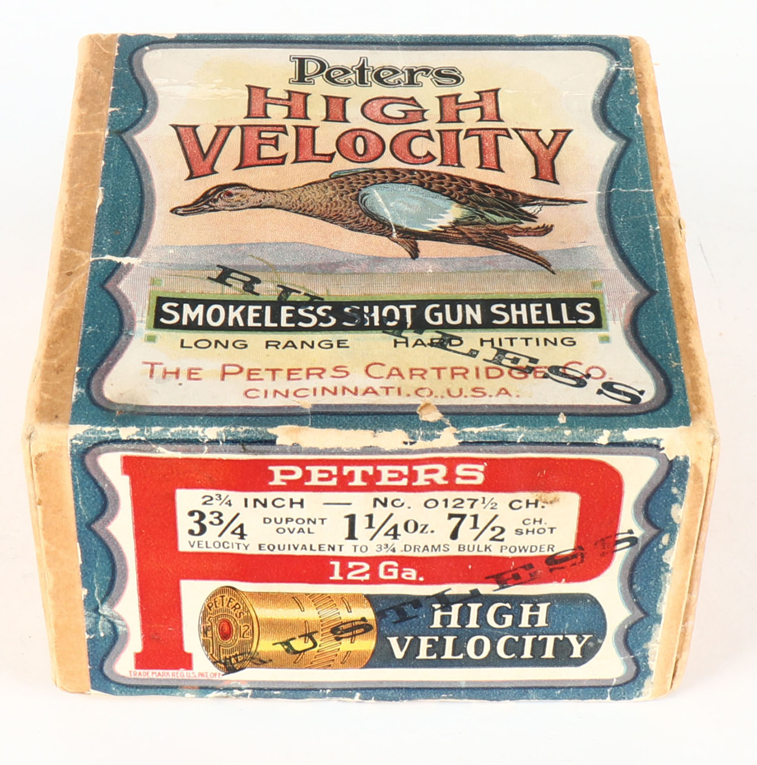Peters Cart. Co., Blue Wing Teal, OVER STAMPED ''RUSTLESS'', 12ga., 2 3/4'', 2pc., Empty, shot size 7 1/2 CH, buff box with multi colored label that pictures Blue Wing Teal in flight, box has light age soiling & light edge wear with very nice colors. Grade: Very Good ++ - Value: 200 to 500