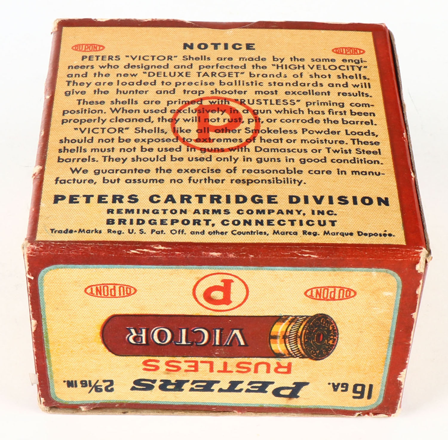Peters Cart. Div., Victor, Rustless, 16ga., 2 9/16'', 1pc., Empty, shot size 8, maroon, cream & orange box, box is solid with light edge wear. Grade: Very Good ++ - Value: 10 to 40