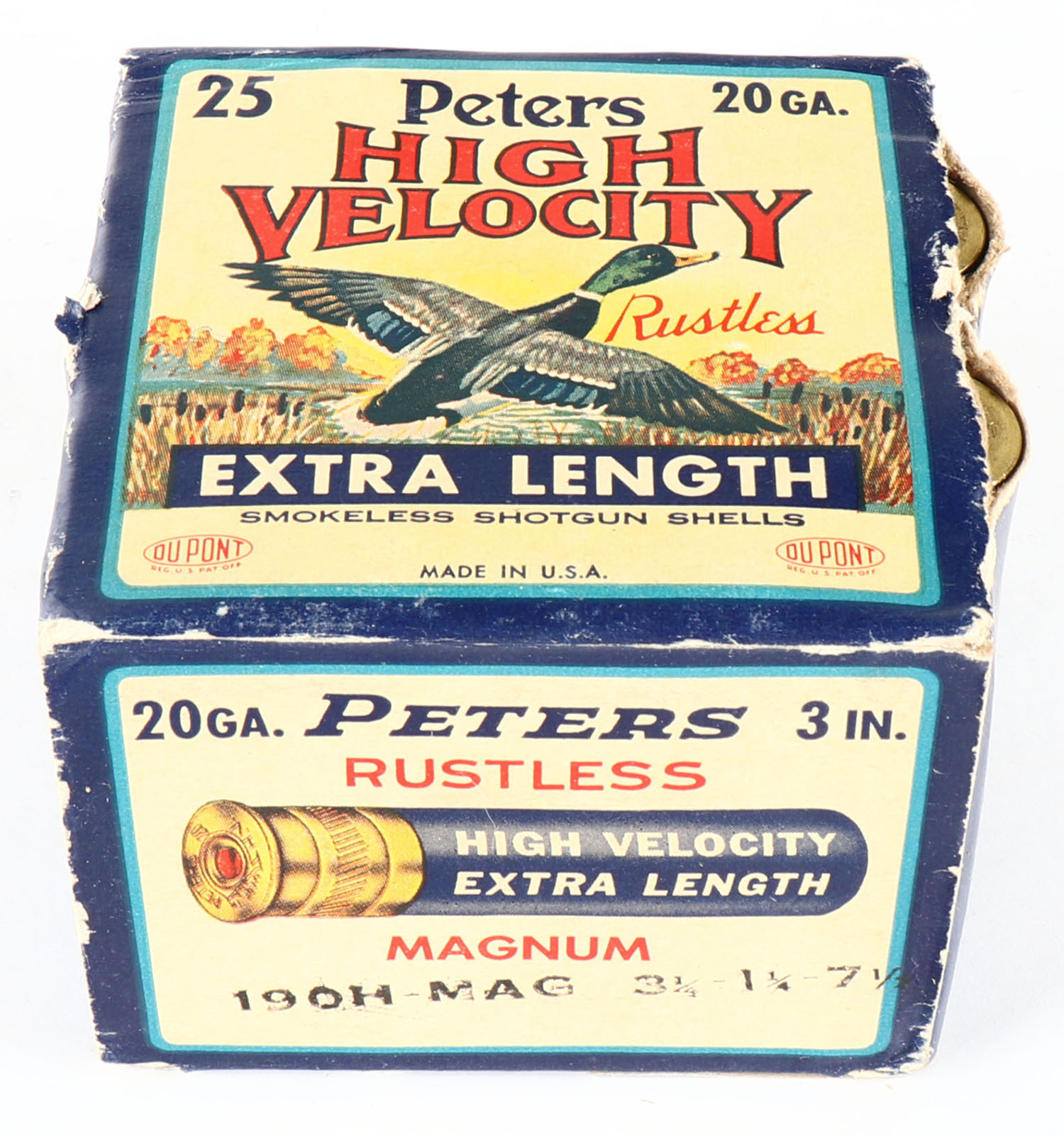 Peters Cart. Co., Bridgeport, CT, High Velocity, EXTRA LENGTH MAGNUM, 20ga., 1pc., Full, shot size 7 1/2, multi colored box that pictures mallard flying out of the marsh grass, box has shell protrusions with great color to box, paper shells are excellent. Grade: Very Good + - Value: 80 to 300