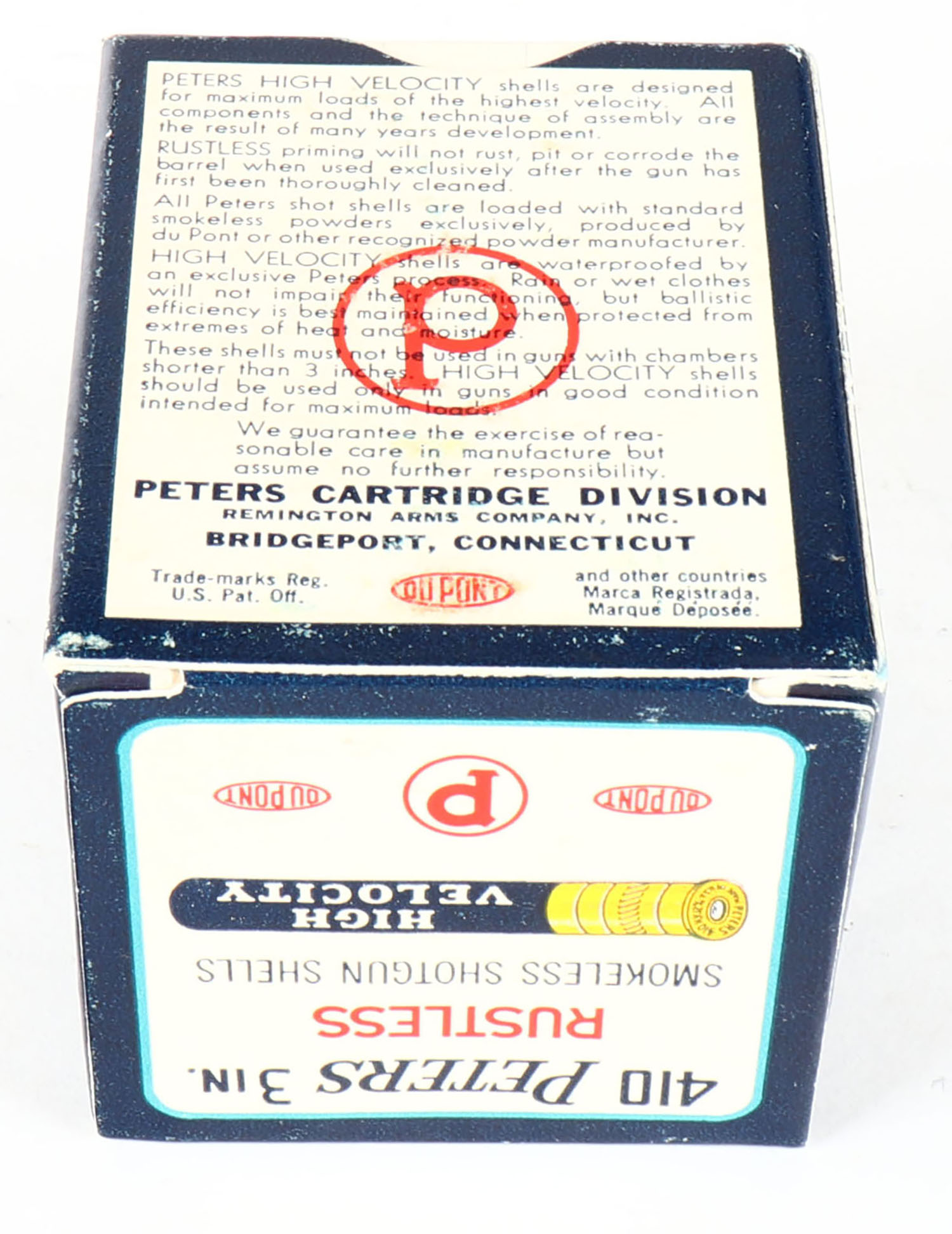 Peters, High Velocity, 410ga., 3'', 1pc., Full, shot size 7 1/2, multi-colored box with mallard duck flying out of marsh grass, box is very solid with great colors, paper shells are minty. Grade: MINT - Value: 40 to 200
