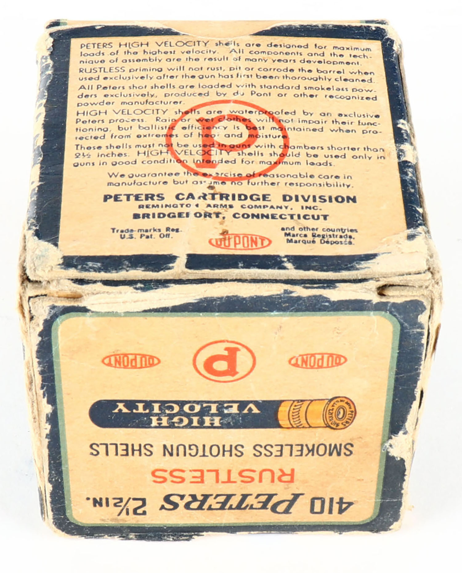 Peters, High Velocity, 410ga., 2 1/2'', 1pc., Full, shot size 7 1/2, multi-colored box with mallard duck flying out of marsh grass, box has age soiling & edge wear, paper shells are very good. Grade: Good - Value: 20 to 100