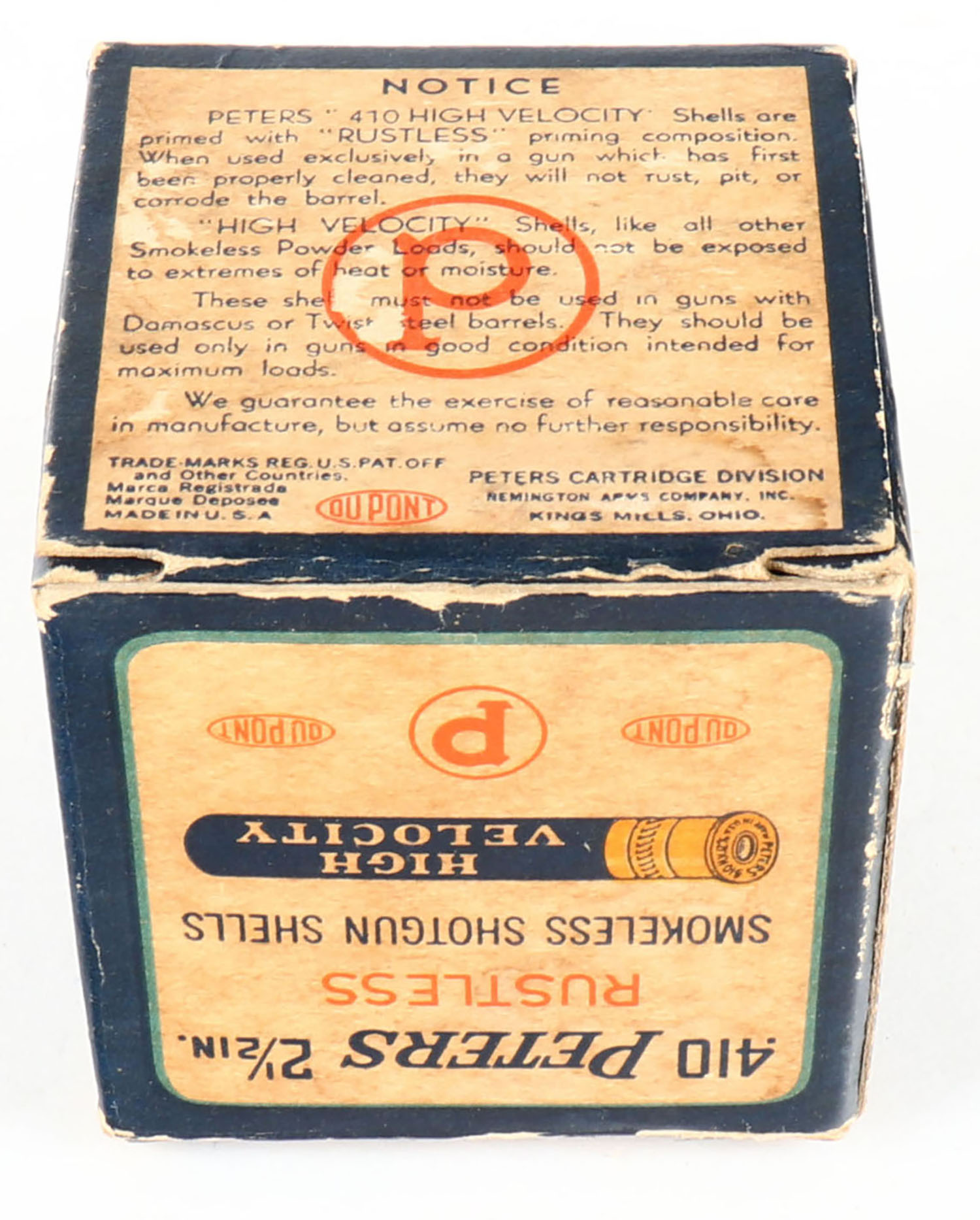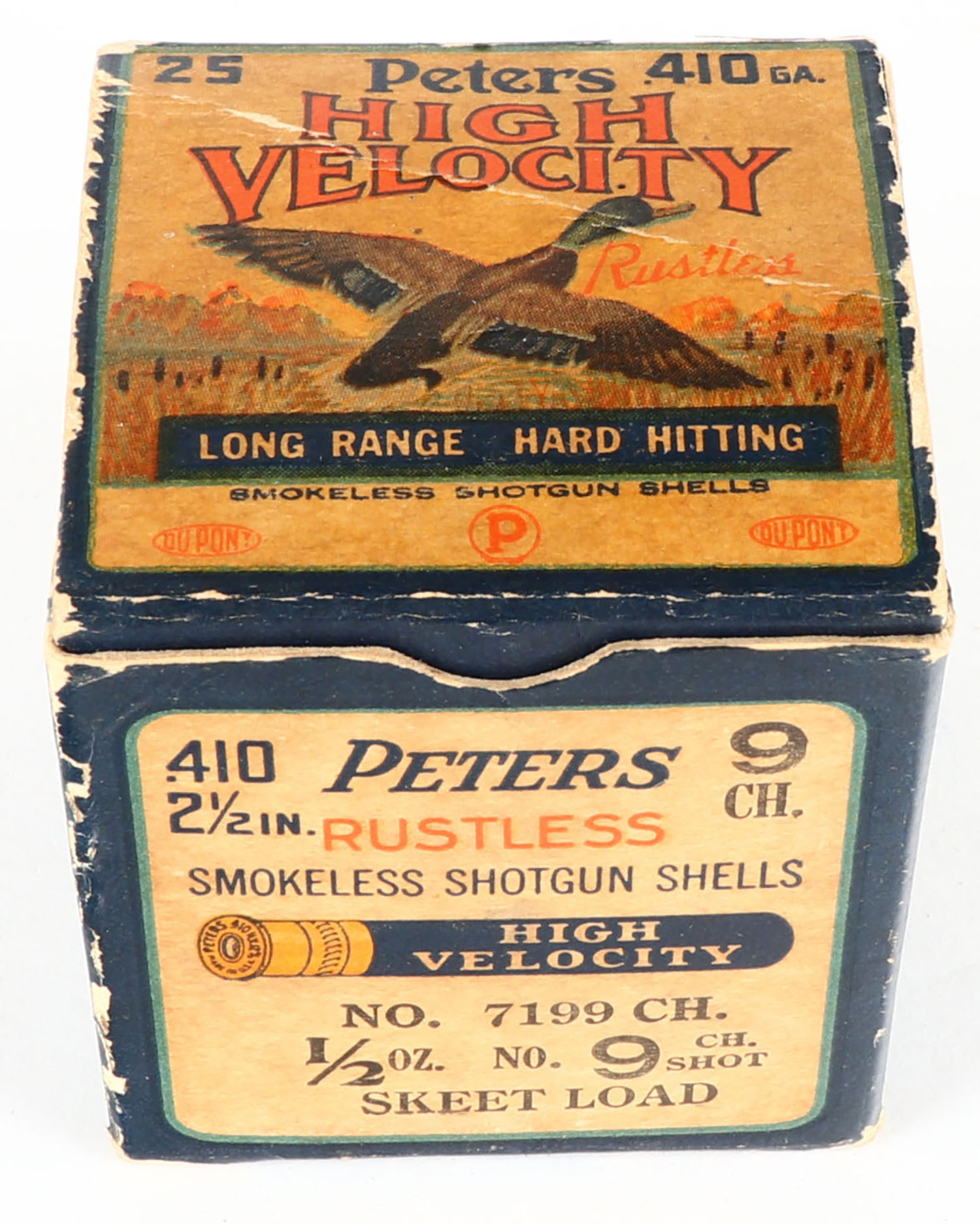 Peters, High Velocity, 410ga., 2 1/2'', 1pc., Empty, shot size 9 Ch. Skeet Load, multi-colored box with mallard duck flying out of marsh grass, box has age soiling with edge wear. Grade: Good ++ - Value: 10 to 40