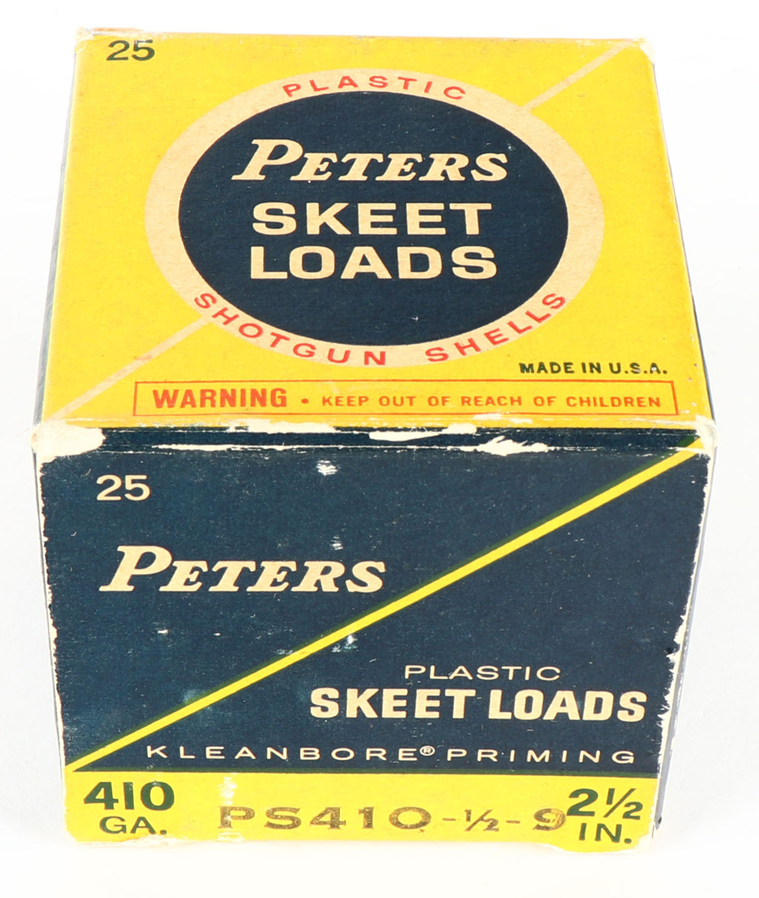 Peter's Cart. Div., 410ga., 2 1/2'', 1pc., Full, Shot size 9 Skeet Load, multi-colored box, box has some edge wear, plastic shells are excellent. Grade: Very Good - Value: 10 to 30