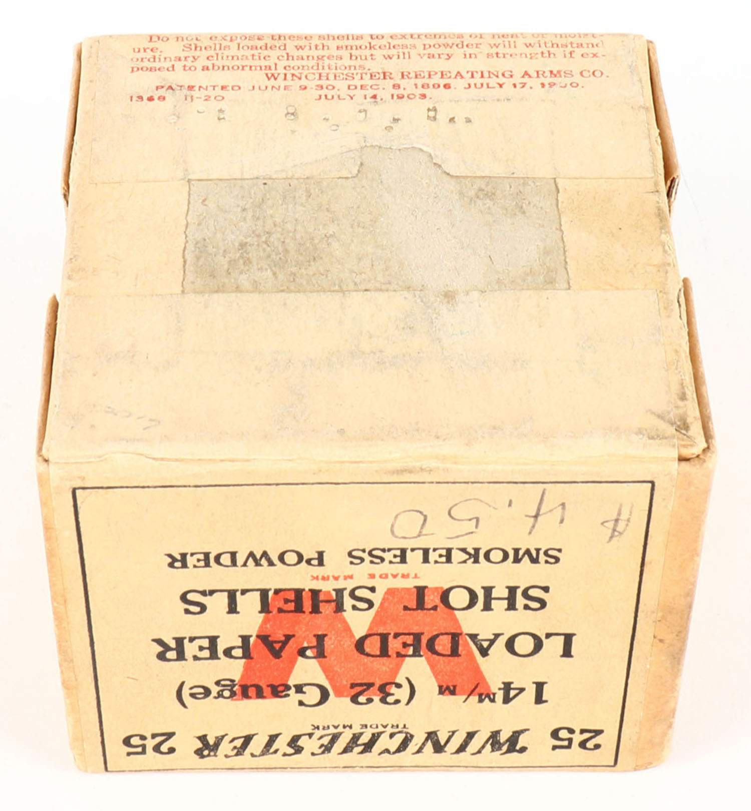 RARE Winchester, 32 GAUGE! 14m/m (32 Gauge), 2pc., FULL & SEALED, PAPER SHOT SHELLS, shot size 7 1/2 CH, Buff box with buff, red & black label, box is very solid with nice colors, VERY RARE & HARD TO FIND IN 32 GAUGE. Grade: Excellent ++ - Value: 400 to 2000
