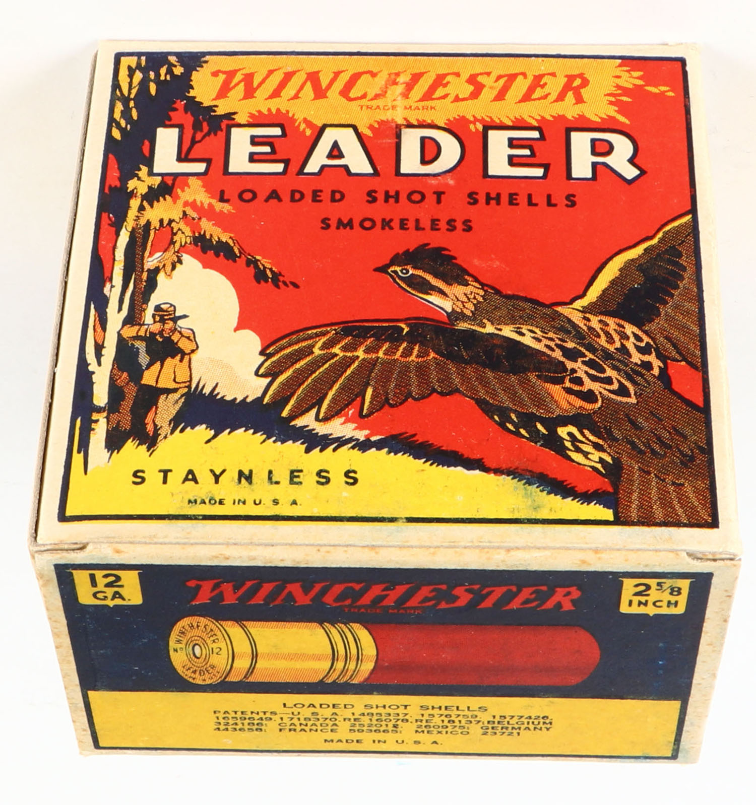 Winchester, LEADER QUAIL BOX, with Acrylic box, NEAR MINT, 12ga., 1pc., Full, shot size 8 Chilled, multi colored box with flying Quail & hunter in background, Staynless, 2 5/8'', Loading: 3 Drams 1 Oz. No. 8 Chilled Shot, box is very solid with amazing colors, Shells are excellent. Grade: Excellent ++ - Value: 600 to 1200