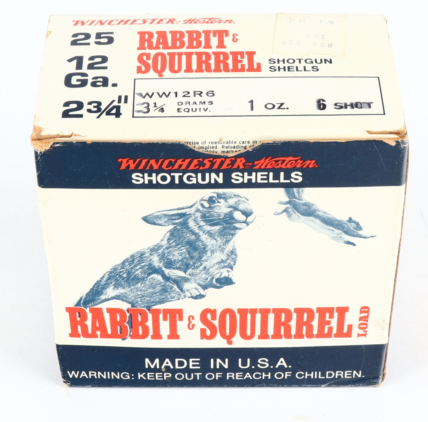 Winchester-Western, Rabbit & Squirrel, 12ga., shot size 6, red, blue, & white box, box is very solid, plastic shells are very good. Grade: Excellent + - Value: 10 to 30