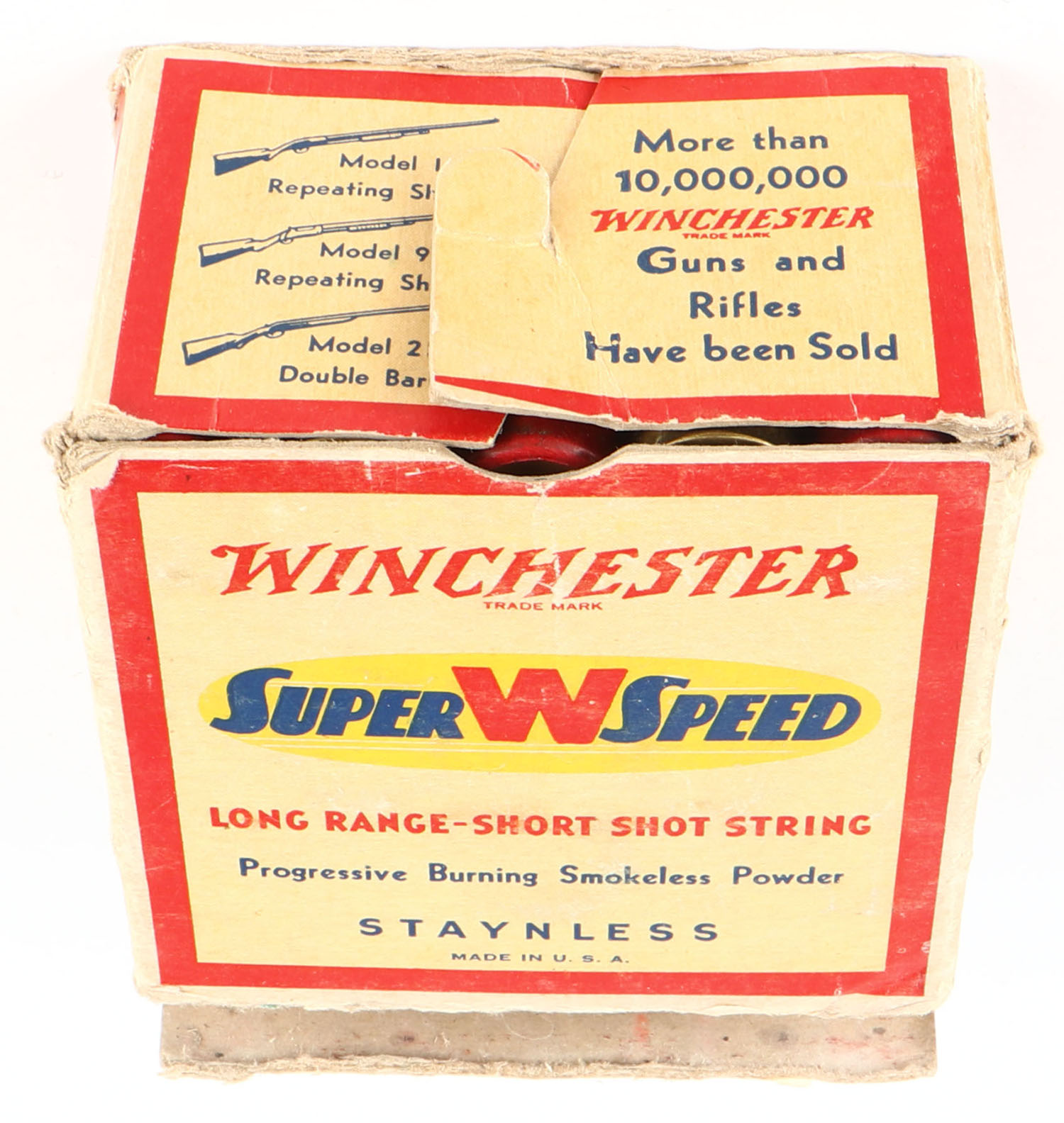 Winchester, Super W Speed, Staynless, 10ga., 2 7/8'', 1pc., Full, shot size 4, cream red, blue and yellow box, box is solid with very nice colors, box is missing top flap, paper shells are excellent. Grade: Very Good - Value: 20 to 100