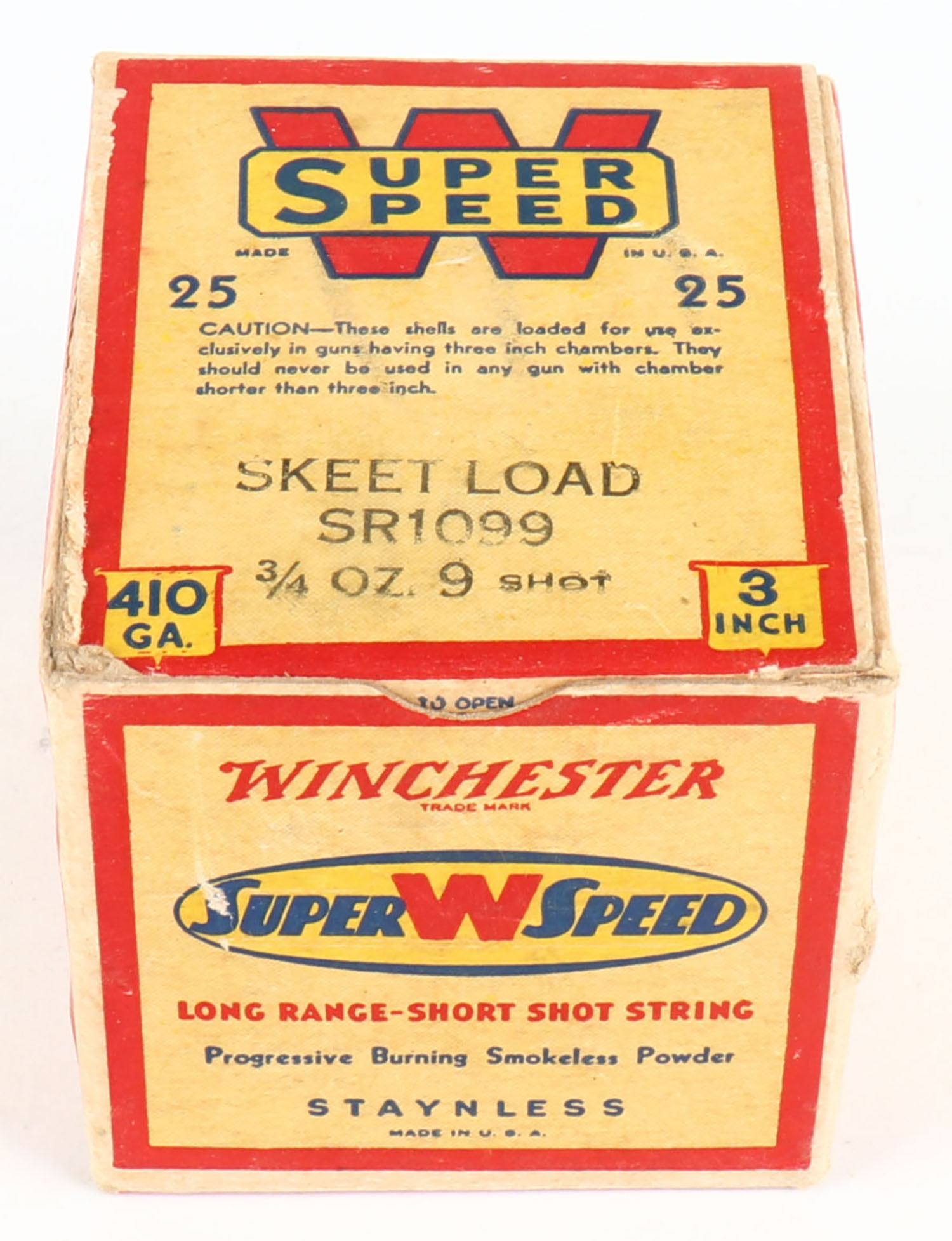 Winchester, Super W Speed, 410ga., Staynless, 3'', 1pc., Full, shot size 9 Skeet Load, cream, red, blue and yellow box, box has minor edge wear, paper shells are excellent. Grade: Excellent - Value: 20 to 60